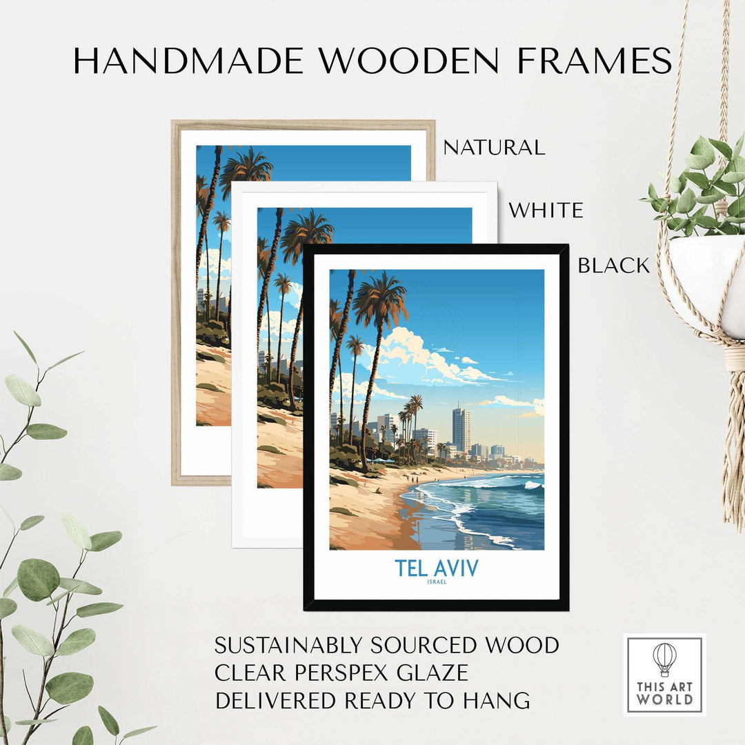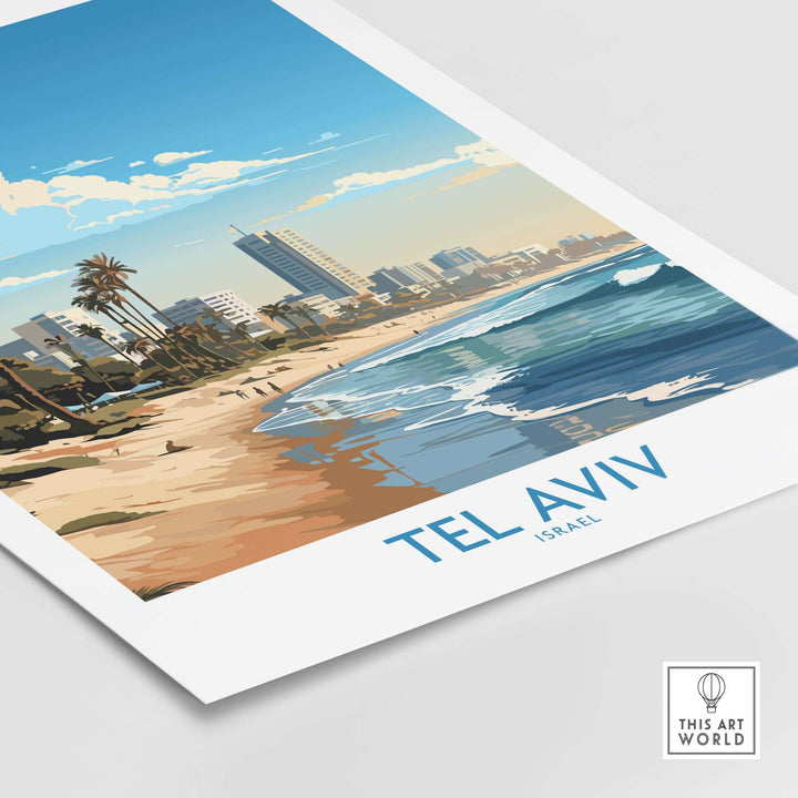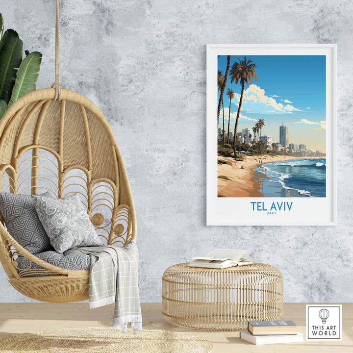 Vacation (or staycation) vibes guaranteed with this stunning Tel Aviv art print! Featuring crisp blue skies, sun, sand and sea, it captures the perfect Israel travel poster look for your home. Get ready to take a break!
