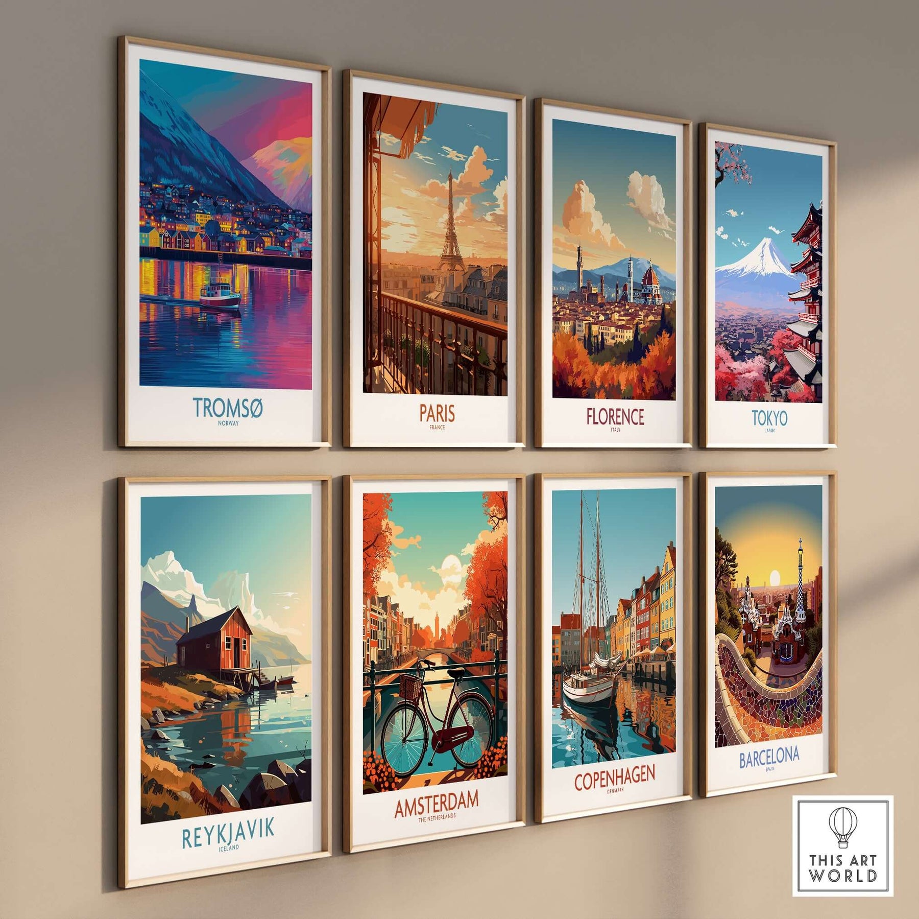 Tromsø Norway Winter Night Art Print | Colorful City Poster displayed among other travel-themed art prints.