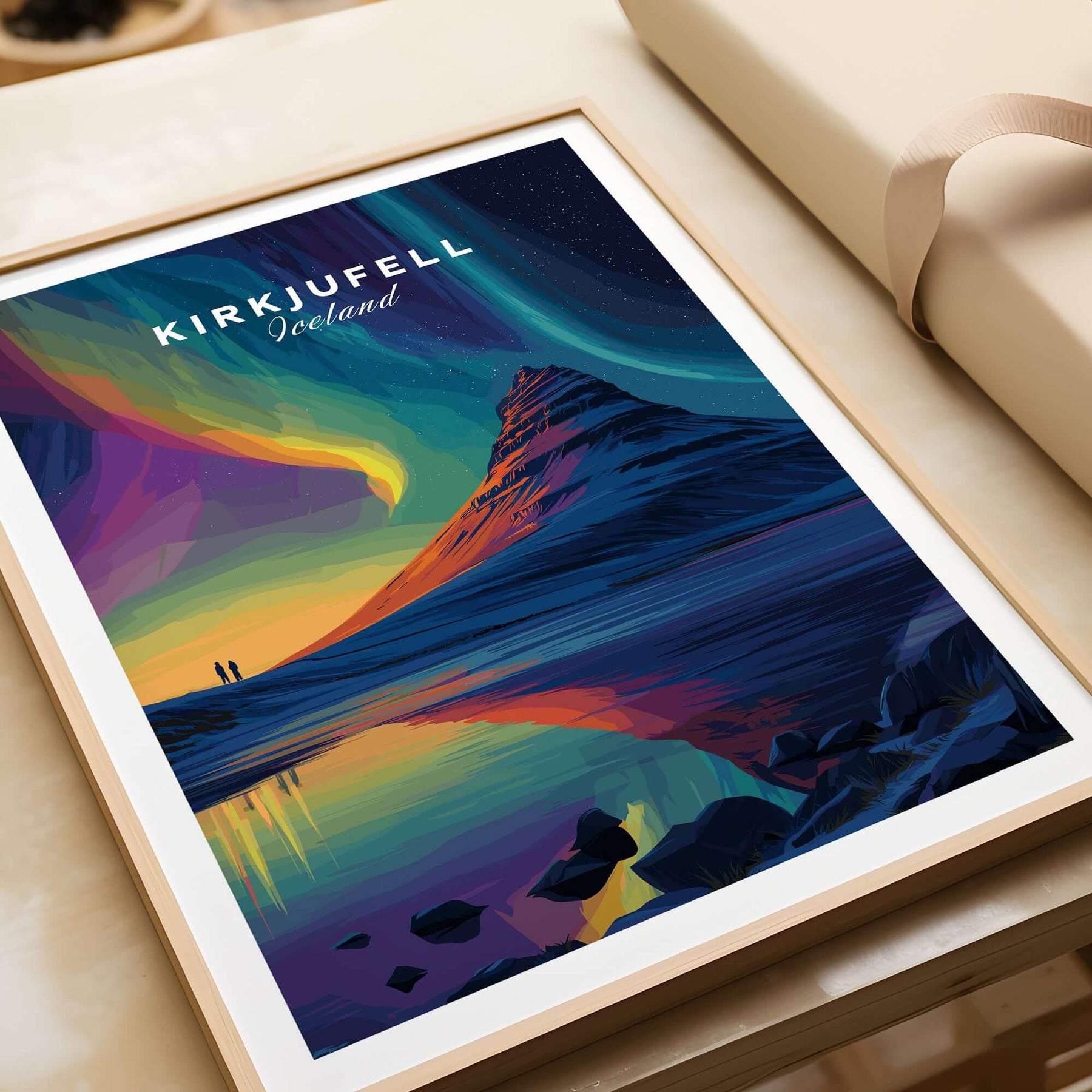 Kirkjufell Poster Snæfellsnes Print | Icelandic Travel Wall Art displayed on a sunny windowsill with vibrant colors.