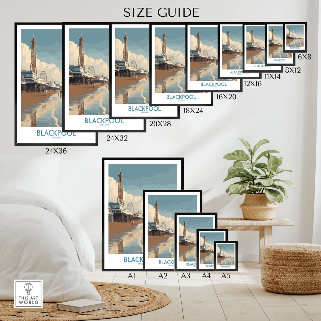 Blackpool England Pier and Tower Art Print | UK Seaside Beach Poster size guide on a living room wall.