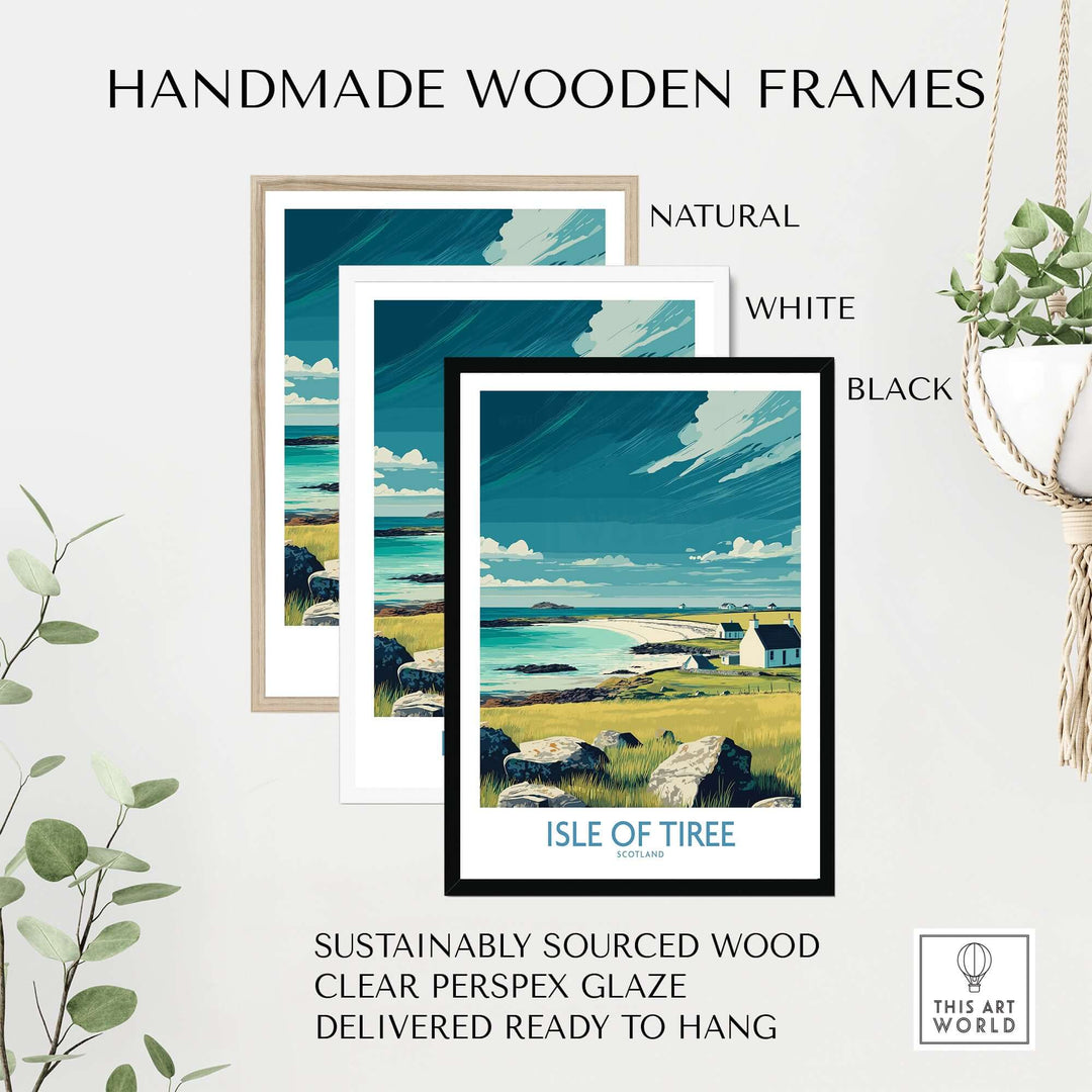Isle of Tiree Scotland Beach Art Print | Coastal Town View Poster framed in natural, white, and black handmade wooden frames.