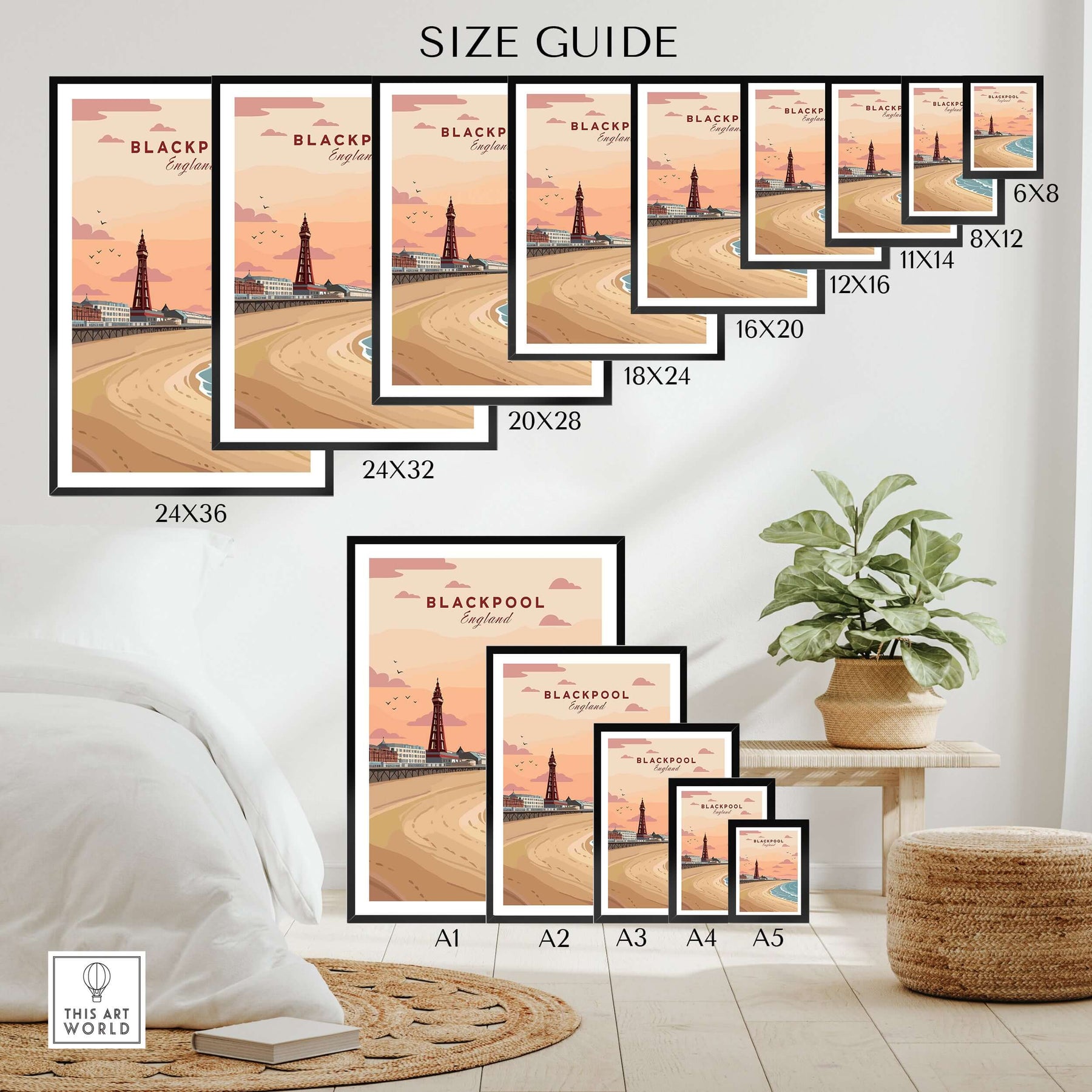 Blackpool Shoreline Promenade View Print | England Travel Wall Decor size guide with various frame dimensions displayed.