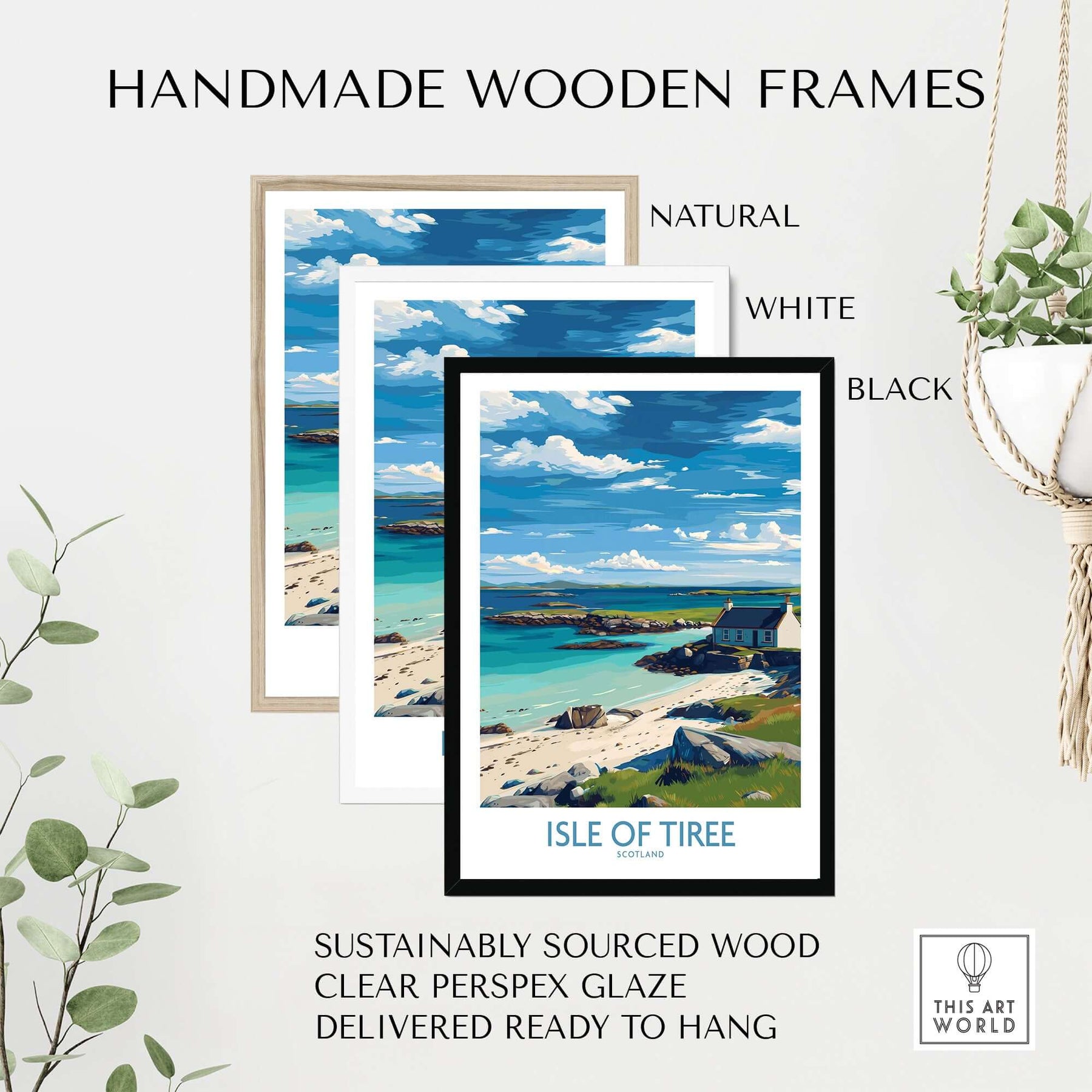 Handmade wooden frames with Isle of Tiree Scotland Print displayed in natural, white, and black options.