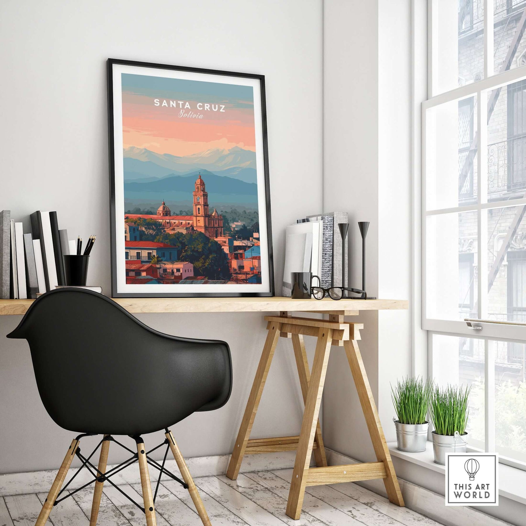 Santa Cruz City Print | Bolivian Home Wall Art showcasing vibrant architecture and mountains in a stylish setting.