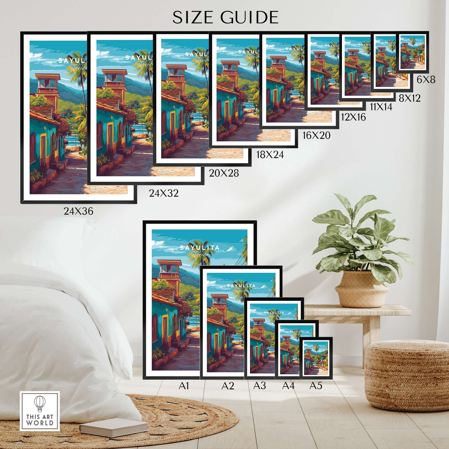 Sayulita Poster | Mexican Travel Wall Art size guide showcasing various frame sizes for home decor.