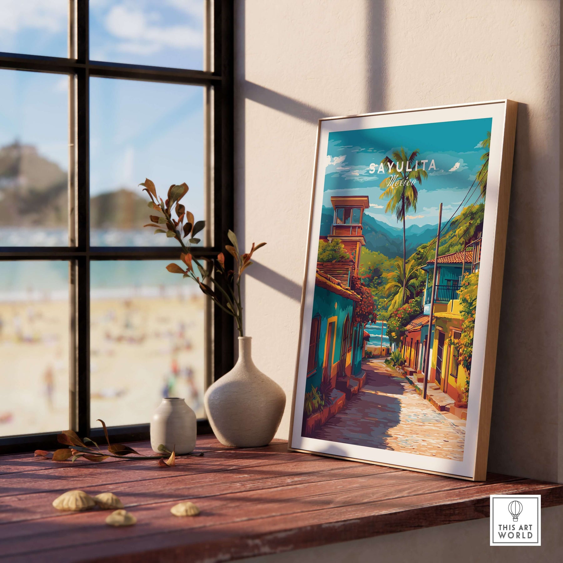Sayulita Poster | Mexican Travel Wall Art displayed in a bright room with coastal view and decorative elements.
