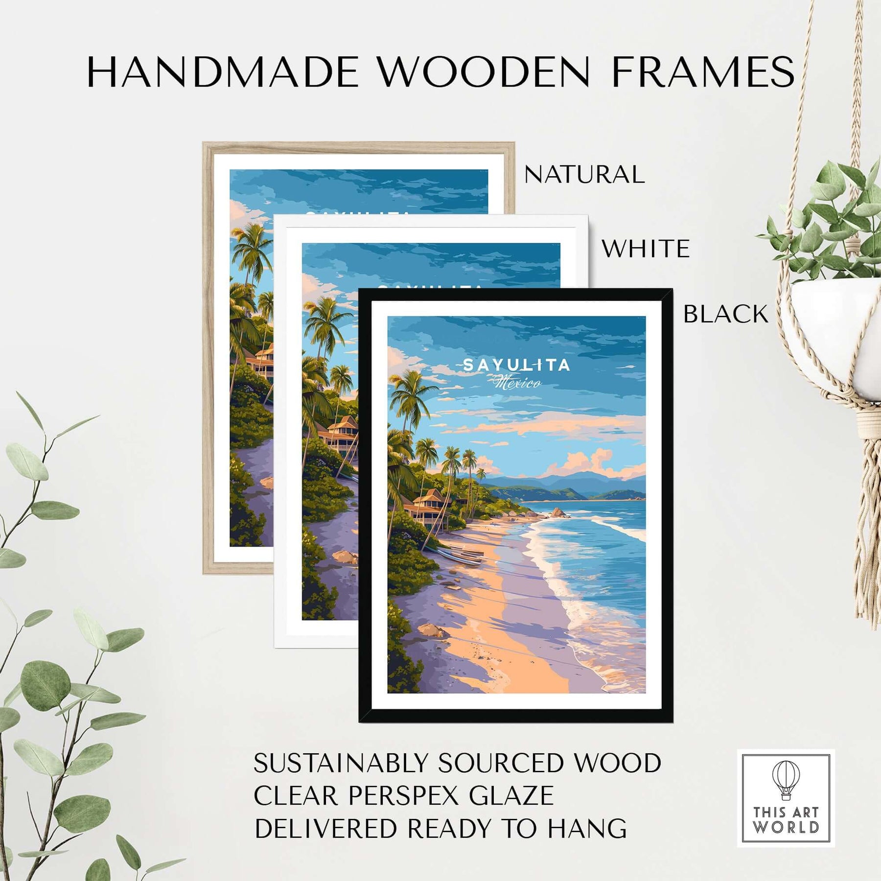 Sayulita Print | Coastal Home Wall Art in handmade wooden frames, showcasing natural, white, and black options.