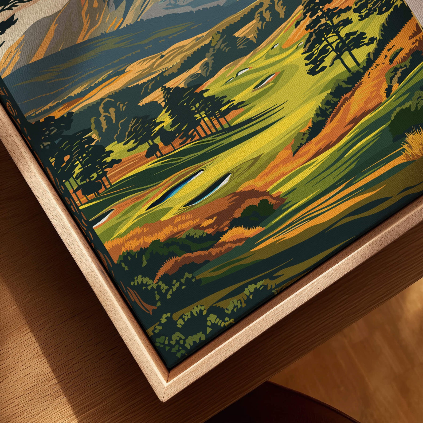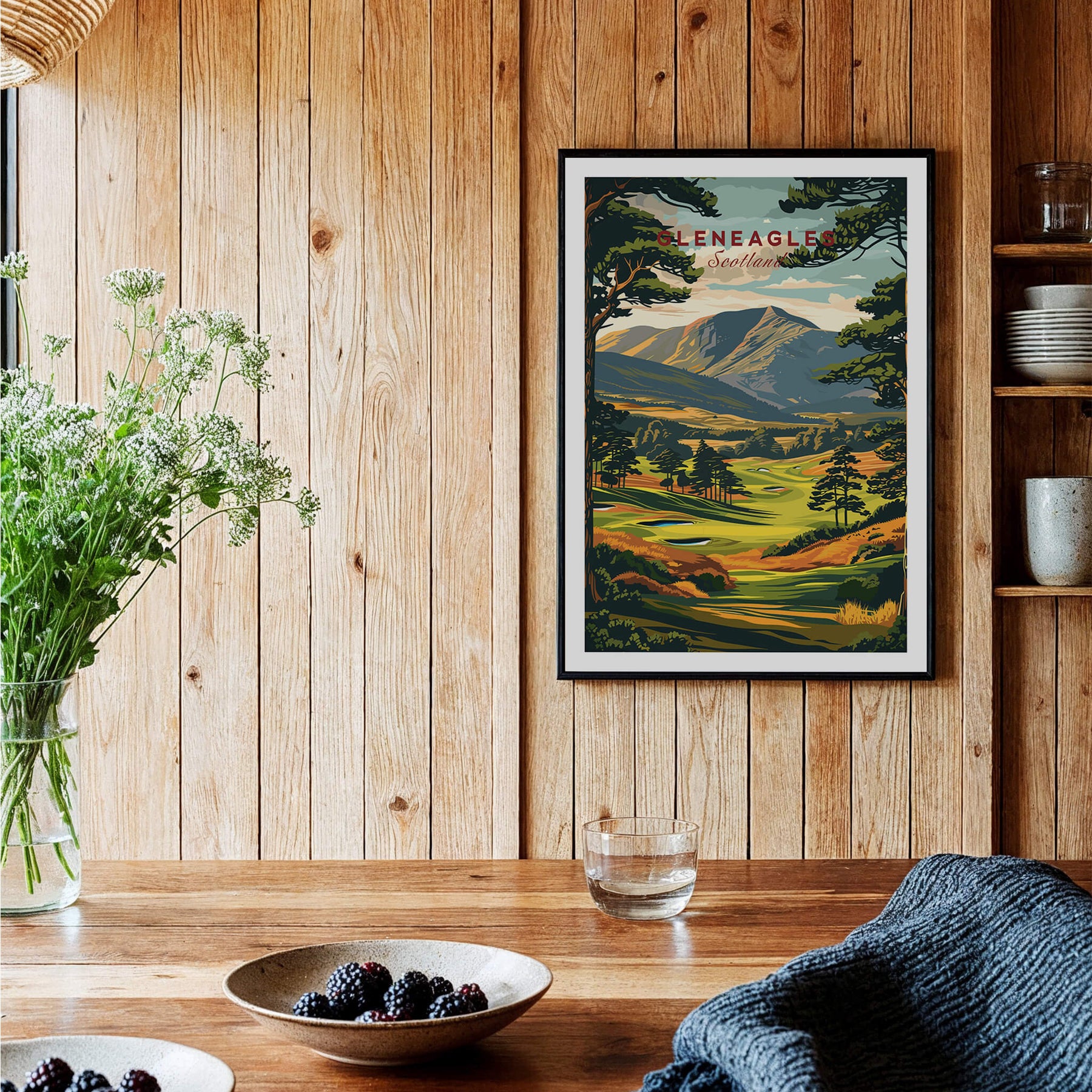 Gleneagles Golf Print Scotland displayed in a cozy home setting with wooden walls and vibrant decor.