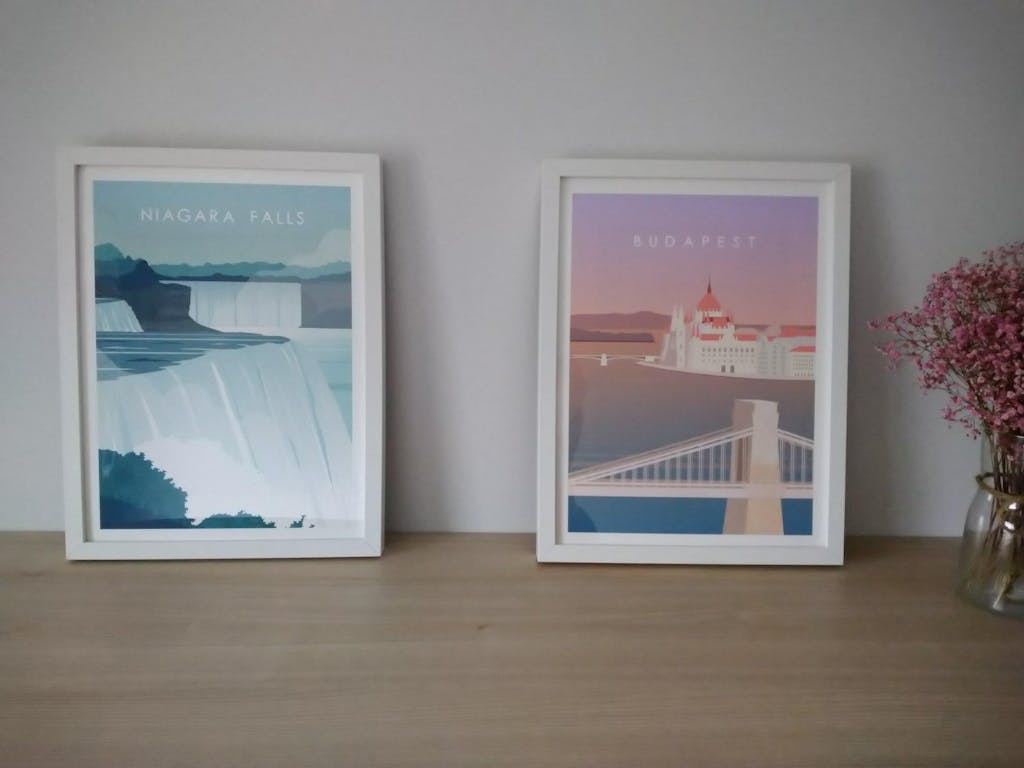 Stylish Budapest print wall art in frames, showcasing travel nostalgia with other city posters on a cozy couch.