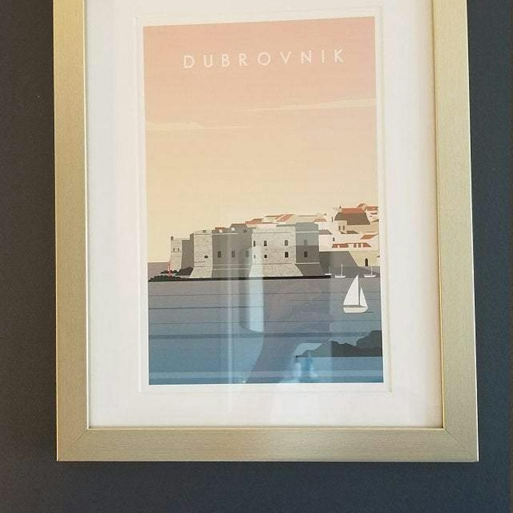 Dubrovnik Print Wall Art Poster featuring vintage-inspired travel design, framed artwork in a stylish interior.