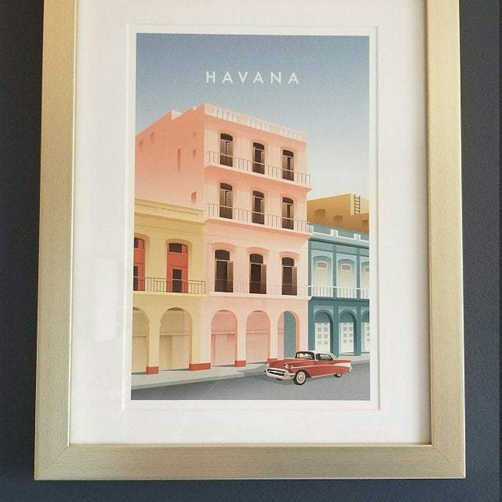 Handmade wooden frames for Havana Wall Art Poster, available in natural, white, and black finishes with clear Perspex glaze.