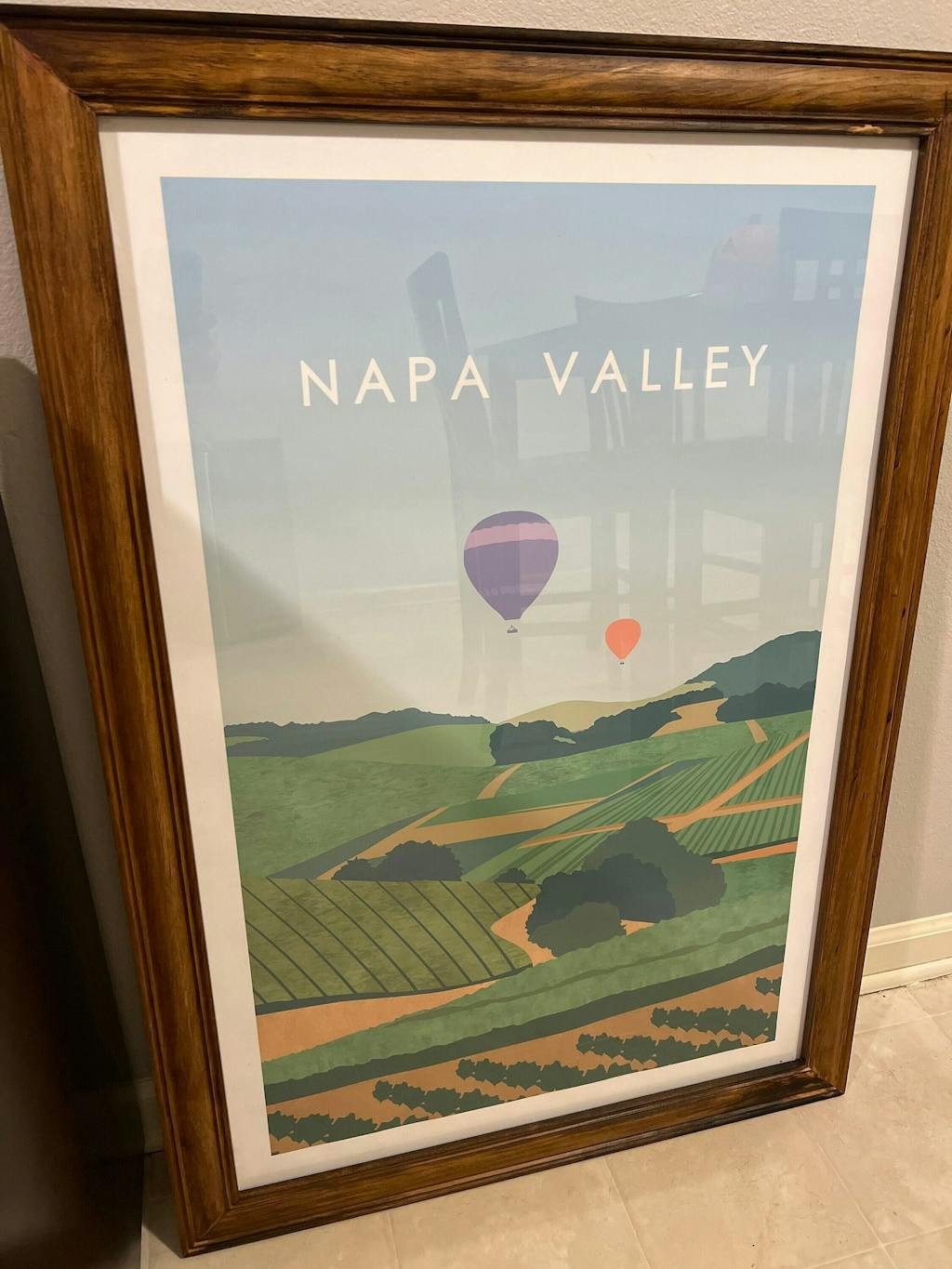 Napa Valley vintage travel poster art showcasing vineyards and hot air balloons in a stylish interior setting.