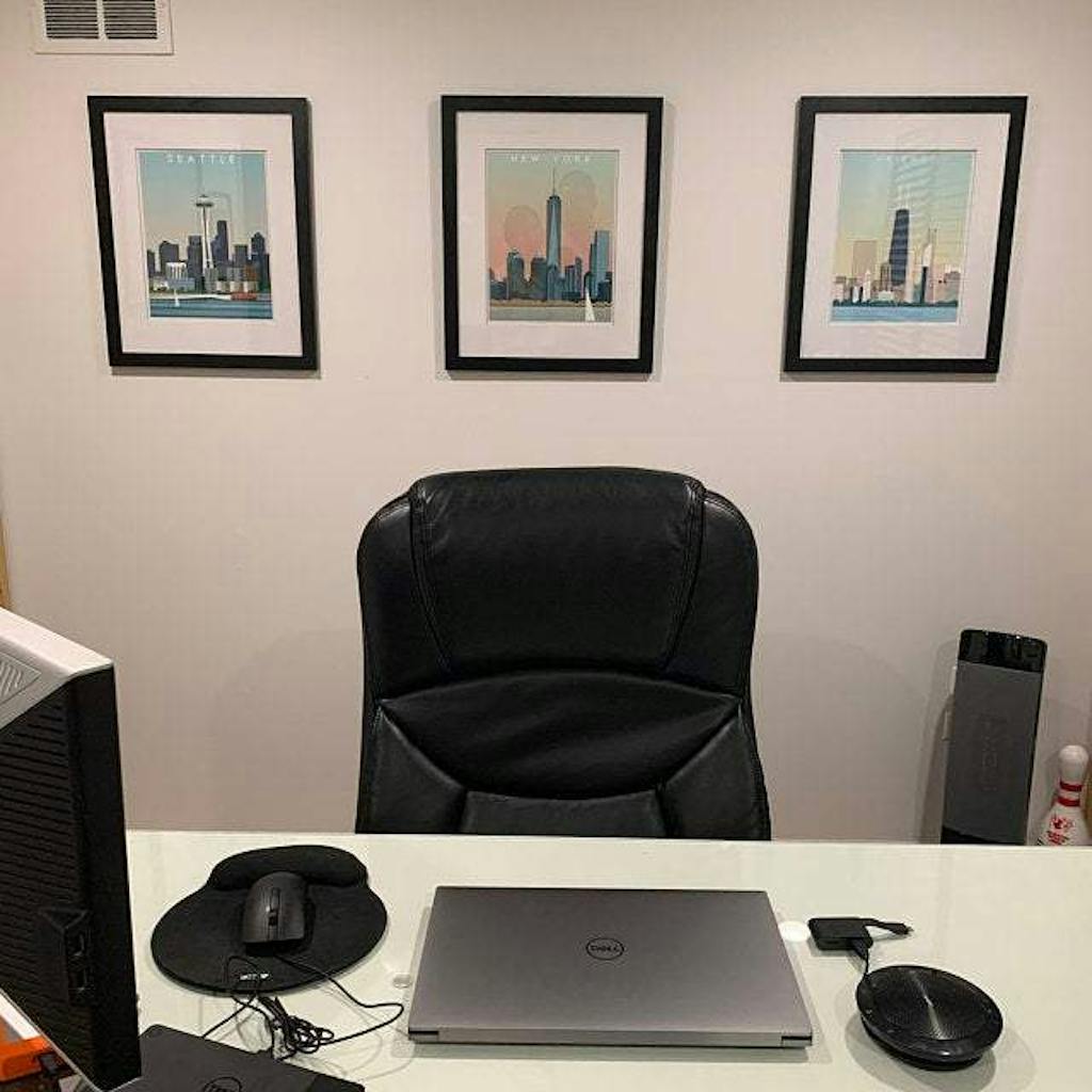 Seattle Print Wall Art Poster displayed in a stylish office setting with natural light and modern decor.