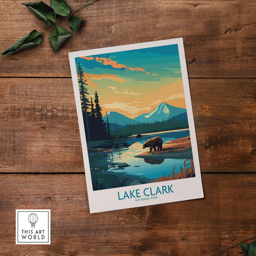 Zeigen Sie Ihre Wertschätzung für die Natur mit diesem atemberaubenden Lake-Clark-Nationalpark-Druck! Mit einem Bären und einem wunderschönen Sonnenuntergang verwandelt dieses Stück Ihre Bilderwand in eine majestätische Erinnerung an die Natur. Genießen Sie die spektakuläre Aussicht auf den Park und genießen Sie die beruhigende Schönheit der Natur.