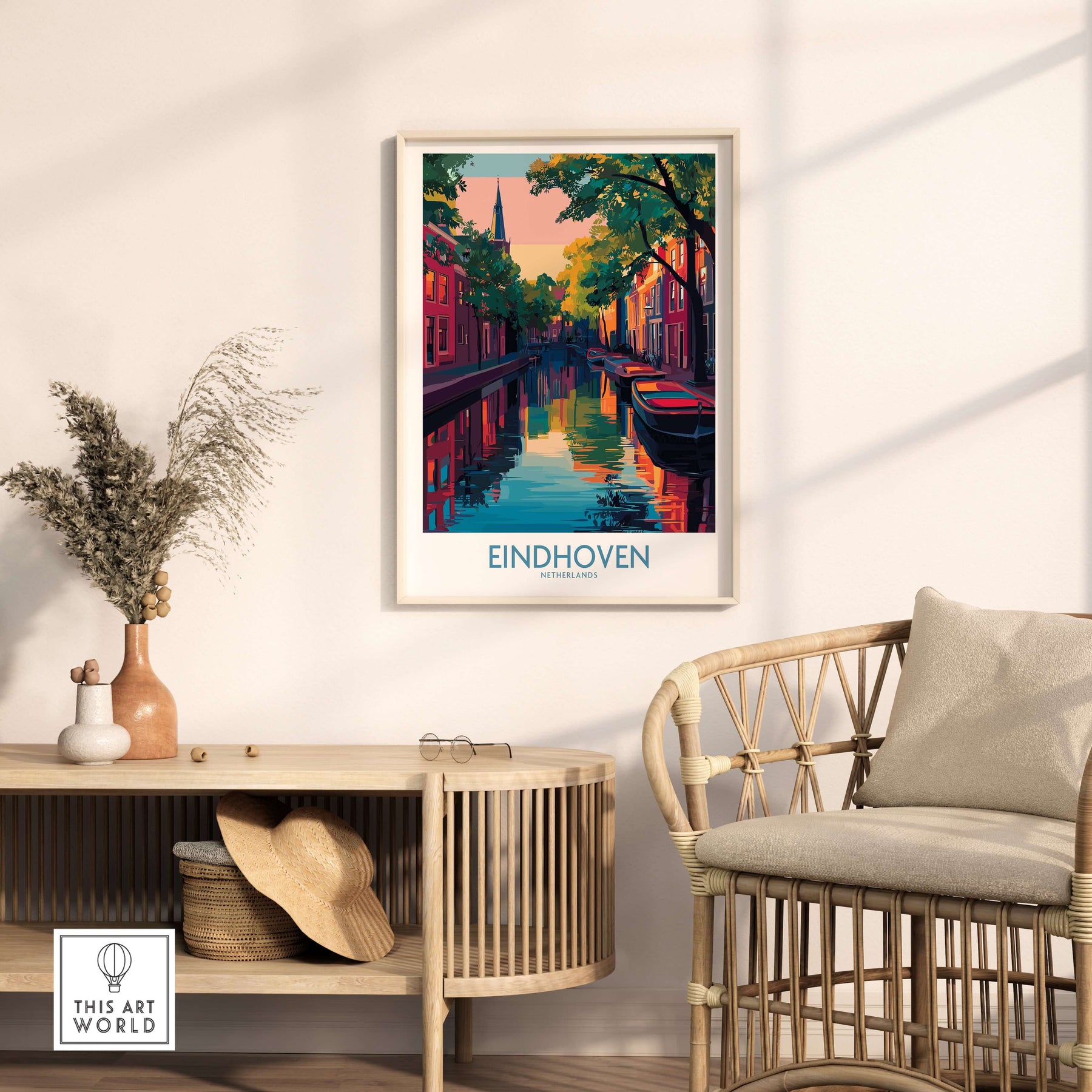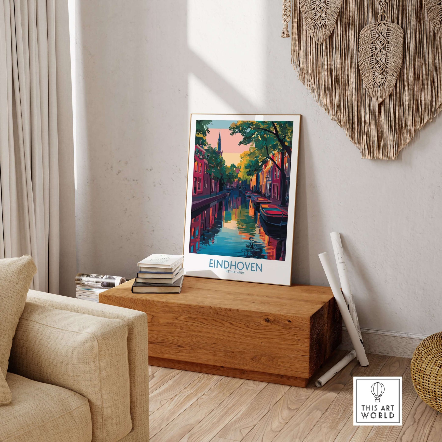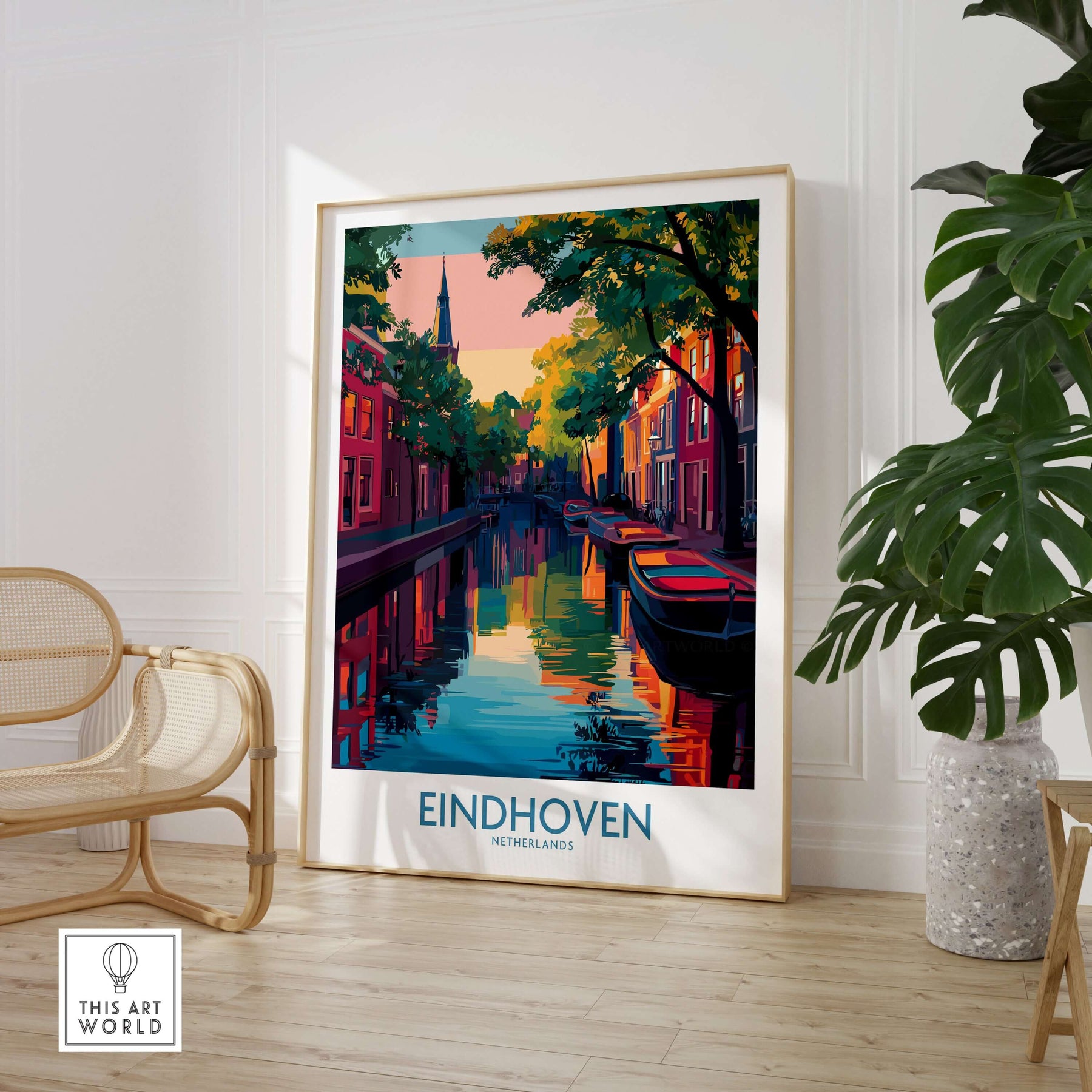Eindhoven Art Print | Urban Sunset Reflections Poster displayed among other travel art prints in a cozy setting.