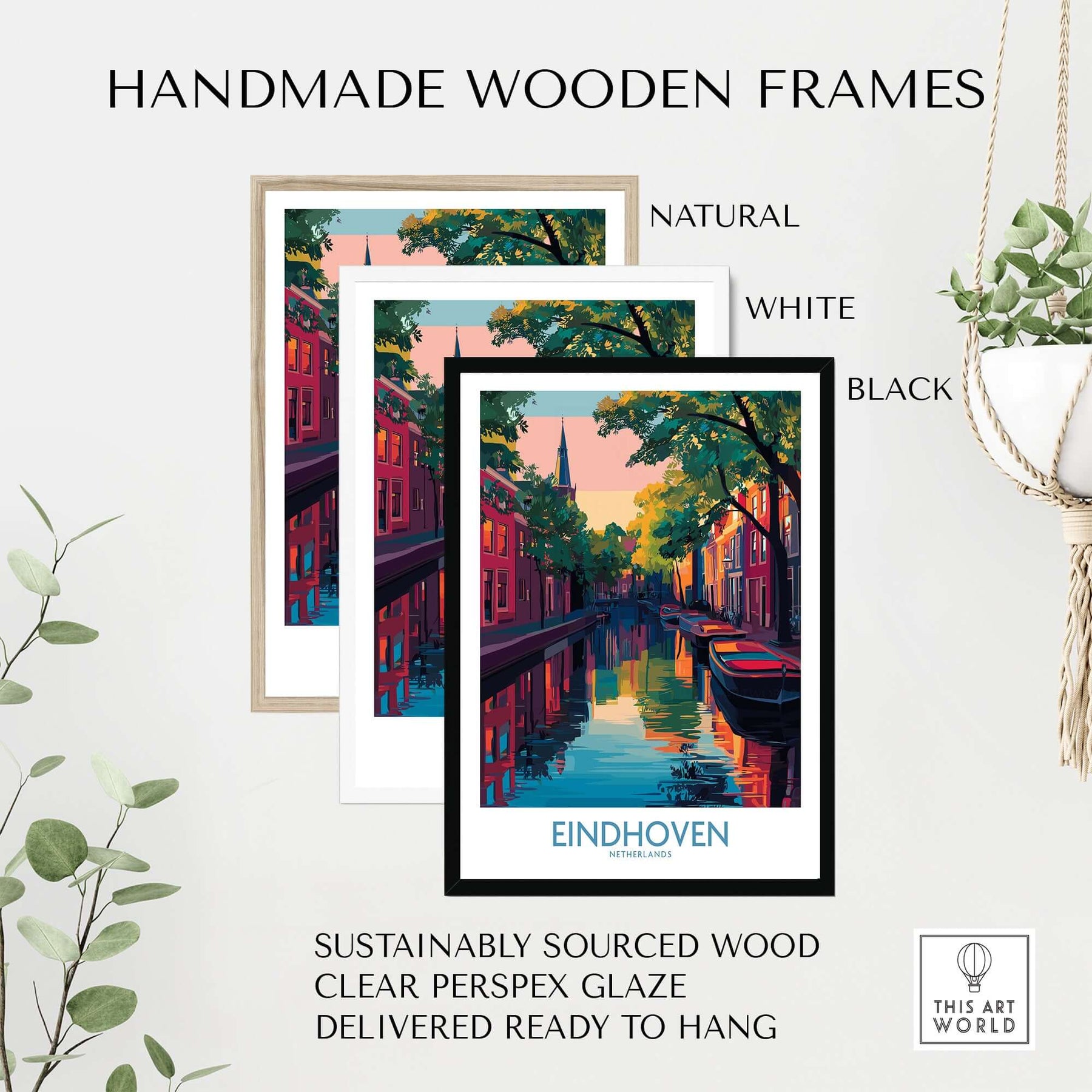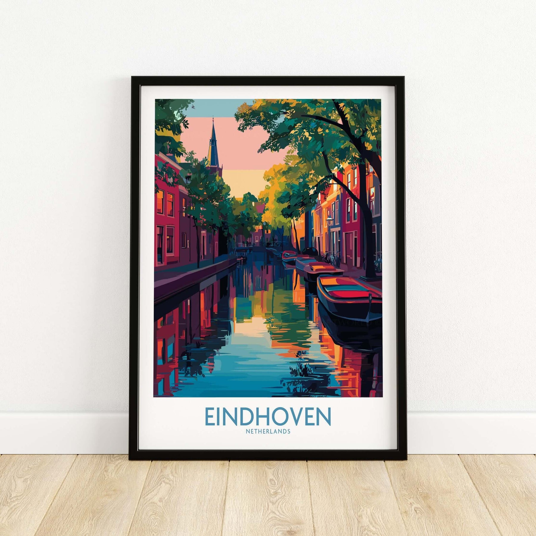 Eindhoven Art Print | Urban Sunset Reflections Poster in handmade wooden frames: natural, white, and black options.