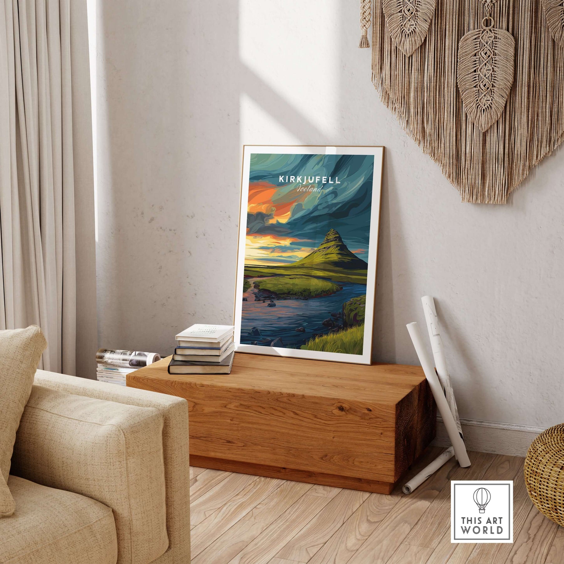 Kirkjufell Poster Snæfellsnes Print | Icelandic Landscape Decor in a cozy living room setting.