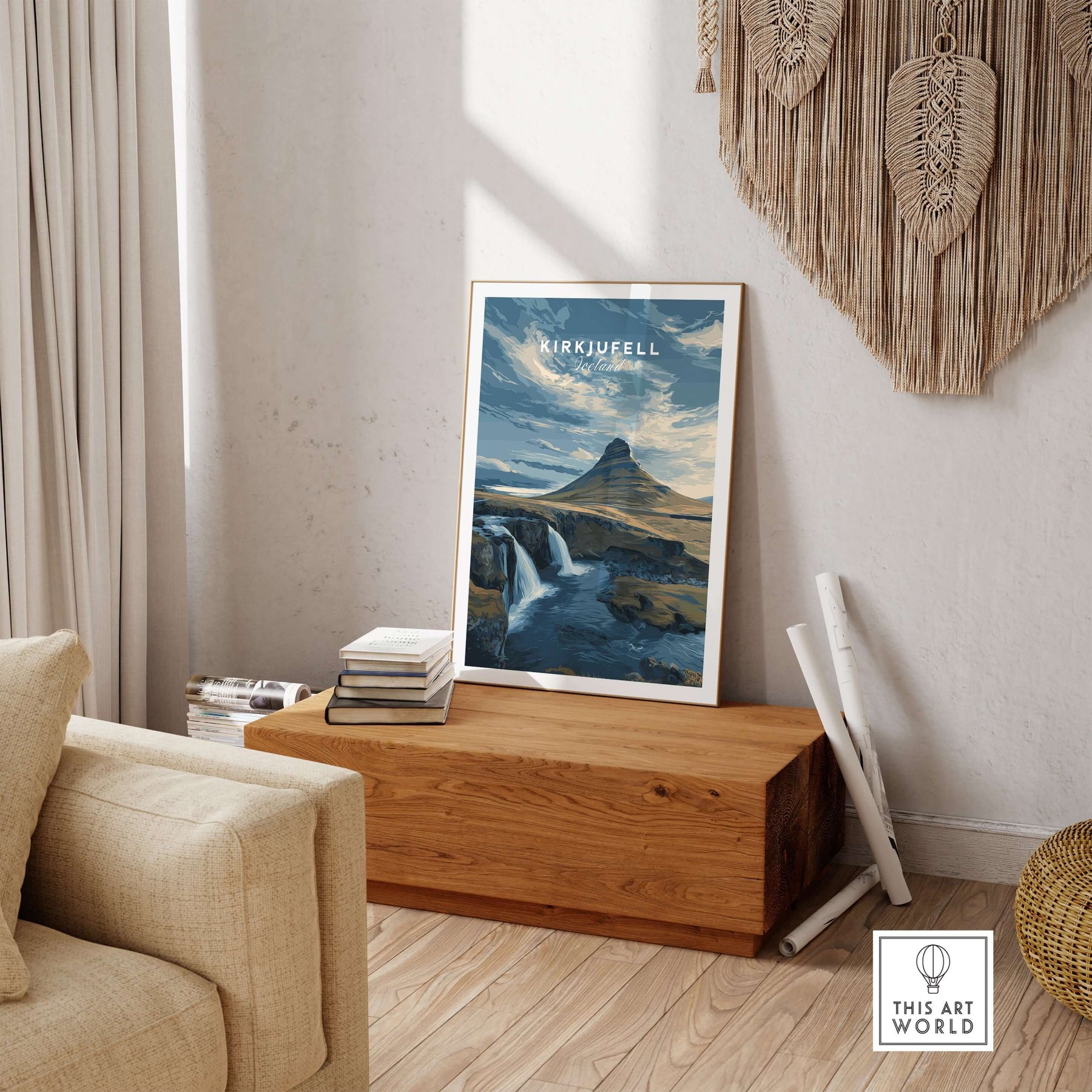 Kirkjufell Print Snæfellsnes Peninsula Poster | Icelandic Nature Wall Art displayed in a cozy interior setting with natural light.