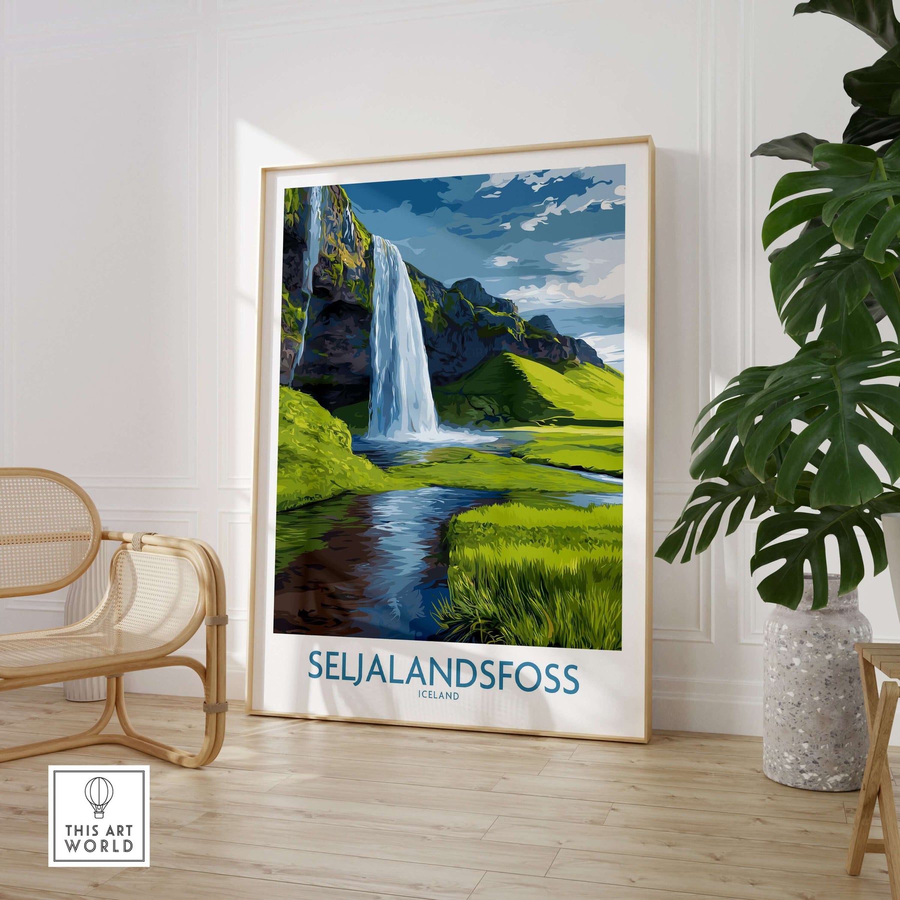 Seljalandsfoss Iceland Waterfall Art Print showcasing the waterfall and lush landscape in a modern home decor setting.