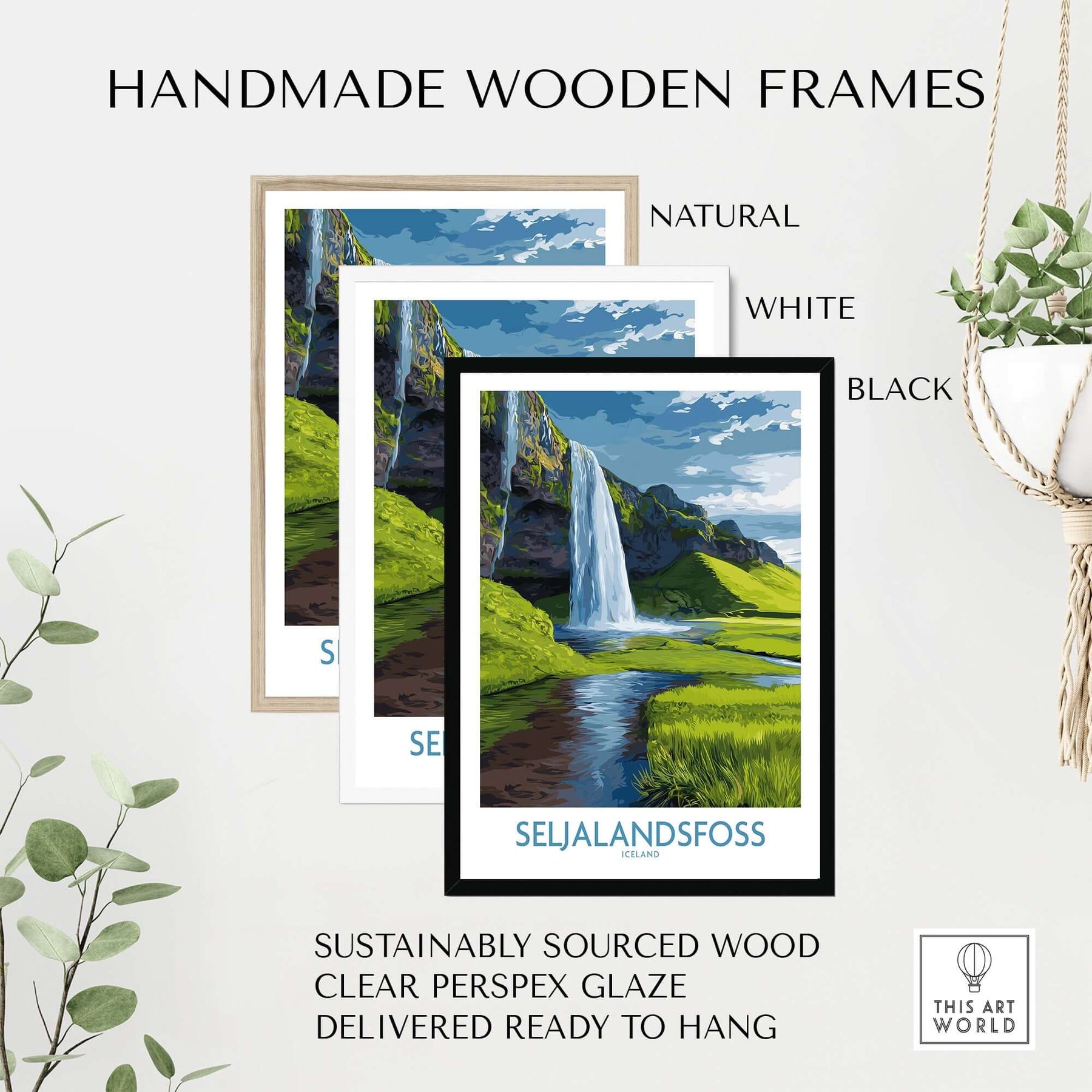 Seljalandsfoss Iceland Waterfall Art Print displayed in natural, white, and black handmade wooden frames.