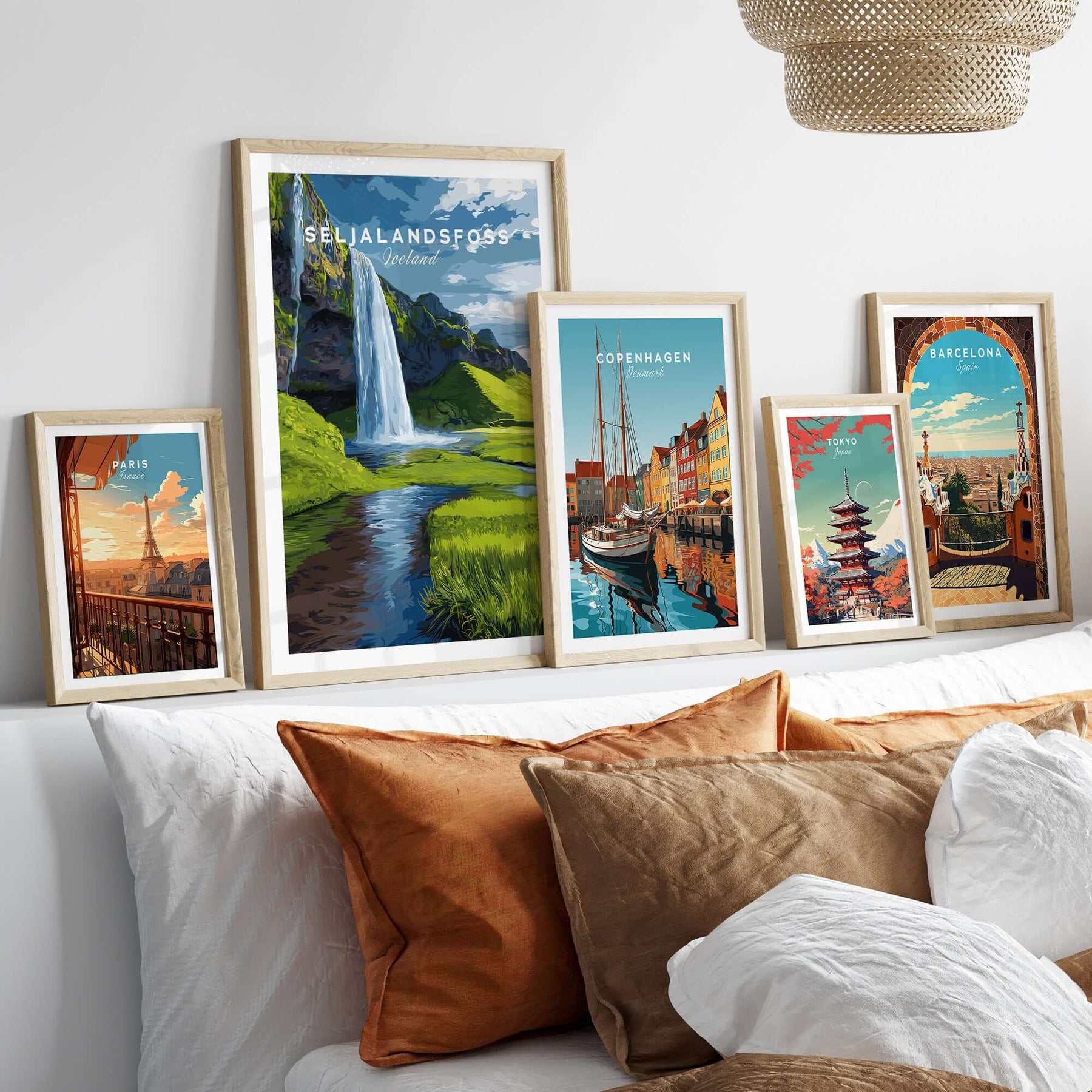 Seljalandsfoss Poster Iceland Print displayed alongside other city posters in a stylish interior setting.