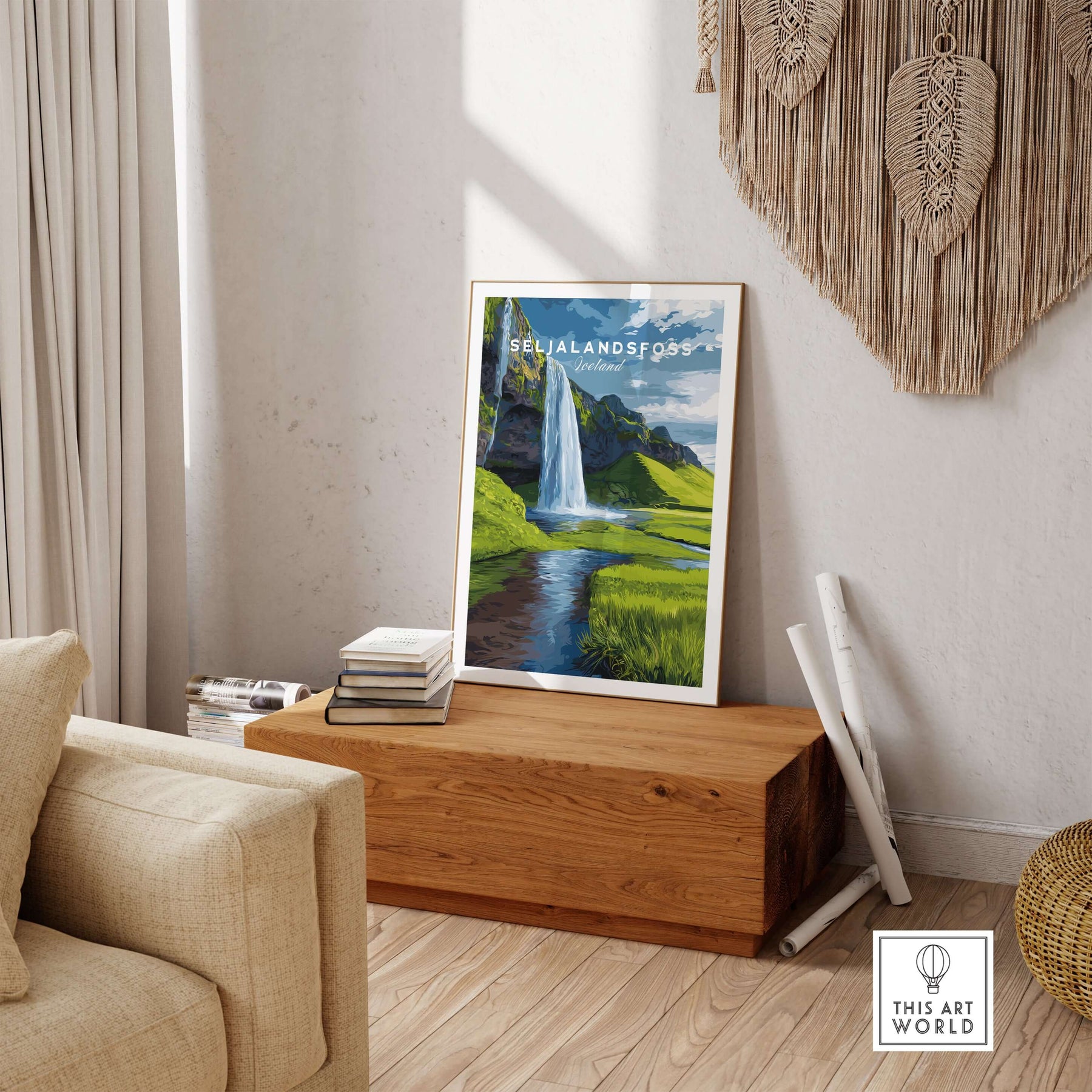 Seljalandsfoss Poster Iceland Print showcasing the iconic waterfall in a stylish living room.