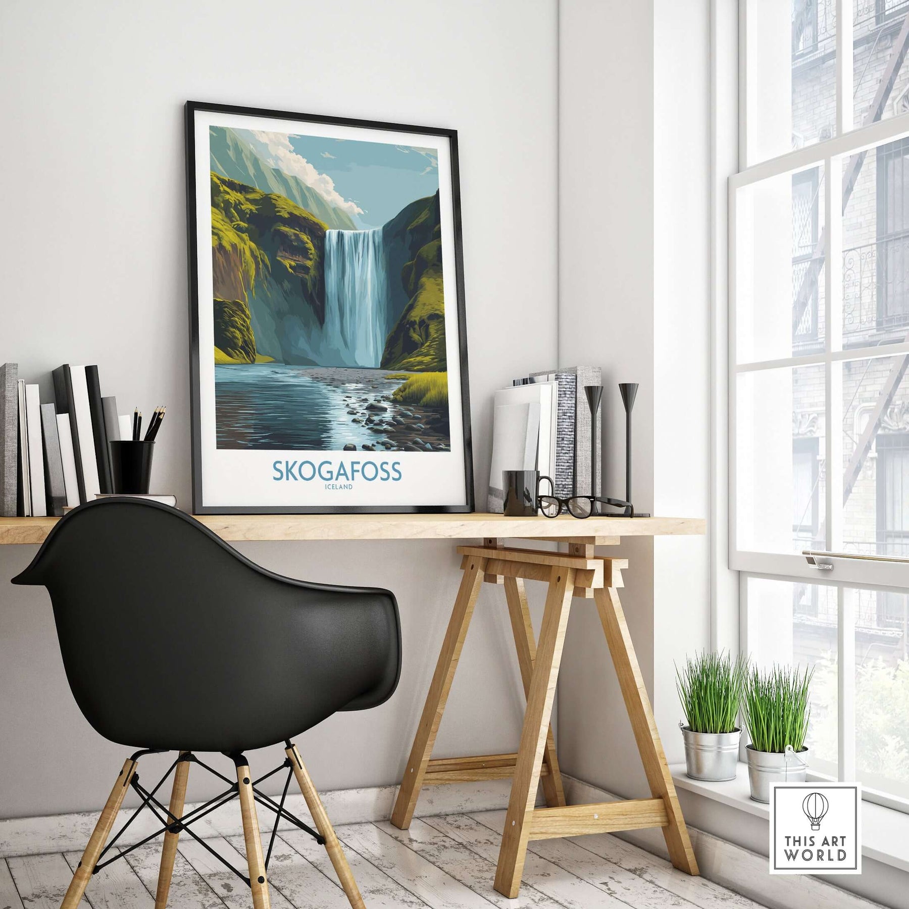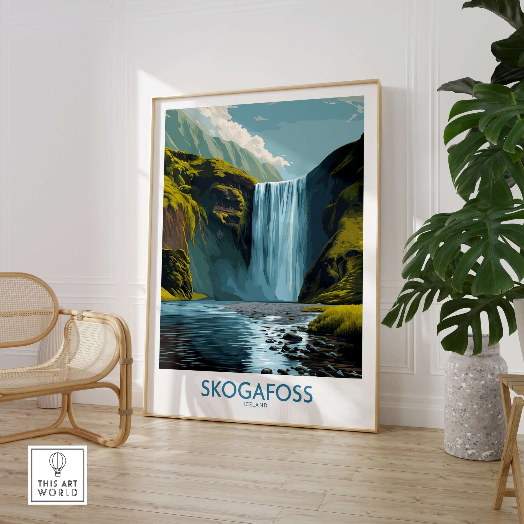 Skógafoss Iceland Art Print Waterfall Poster featuring a stunning waterfall in a modern home setting.