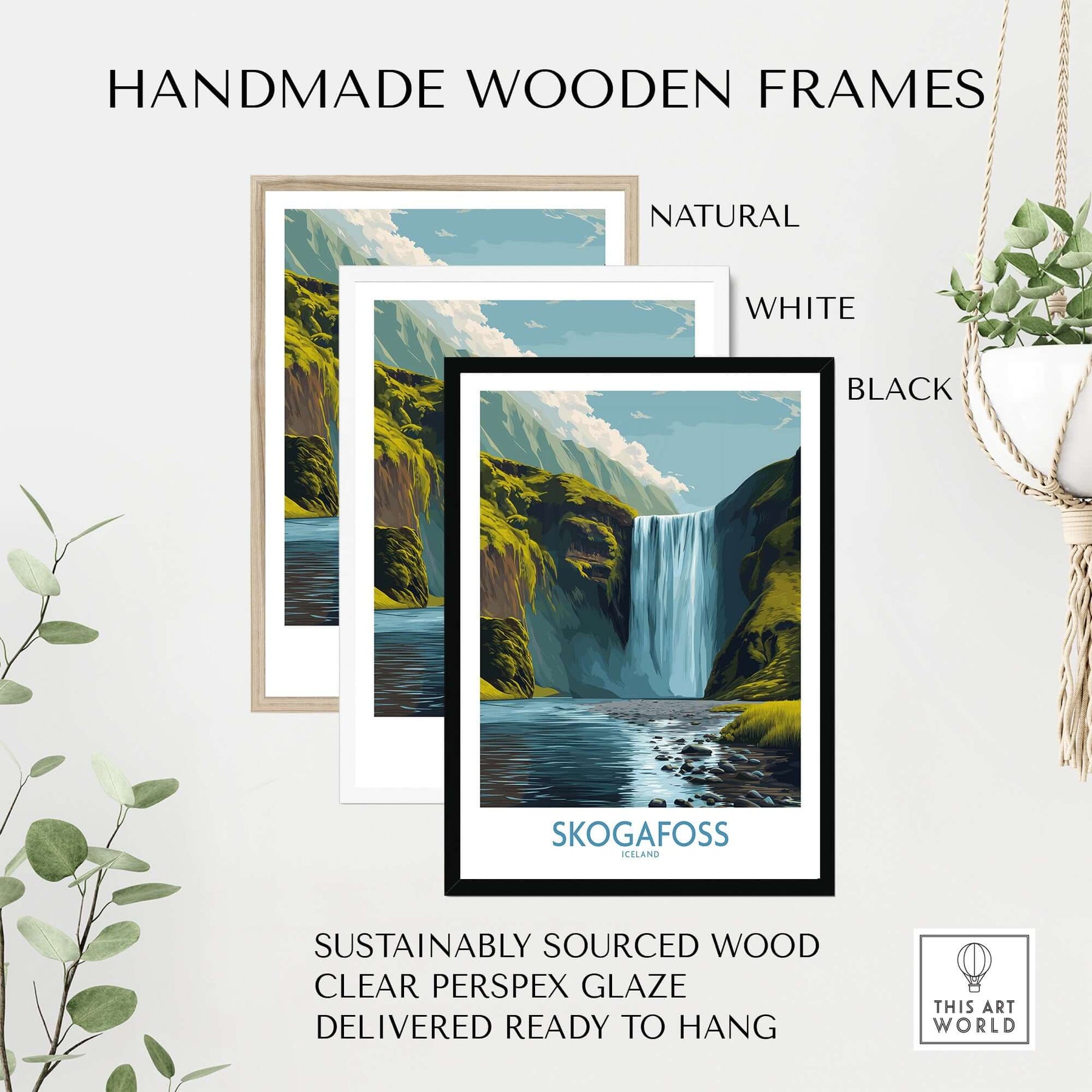 Skógafoss Iceland Art Print Waterfall Poster displayed in handmade wooden frames in natural, white, and black finishes.