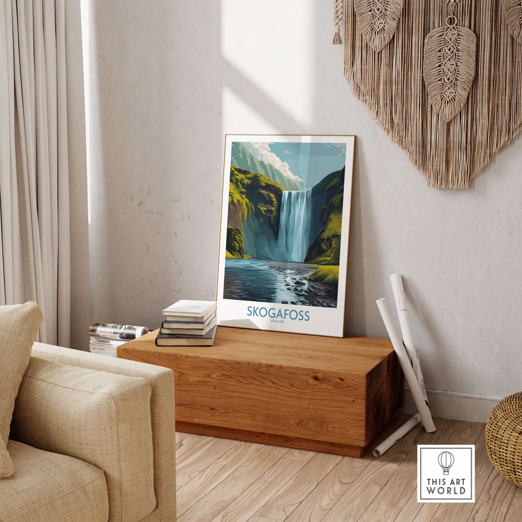 Skógafoss Iceland Art Print Waterfall Poster displayed inside a cozy room, featuring a stunning waterfall and natural scenery.