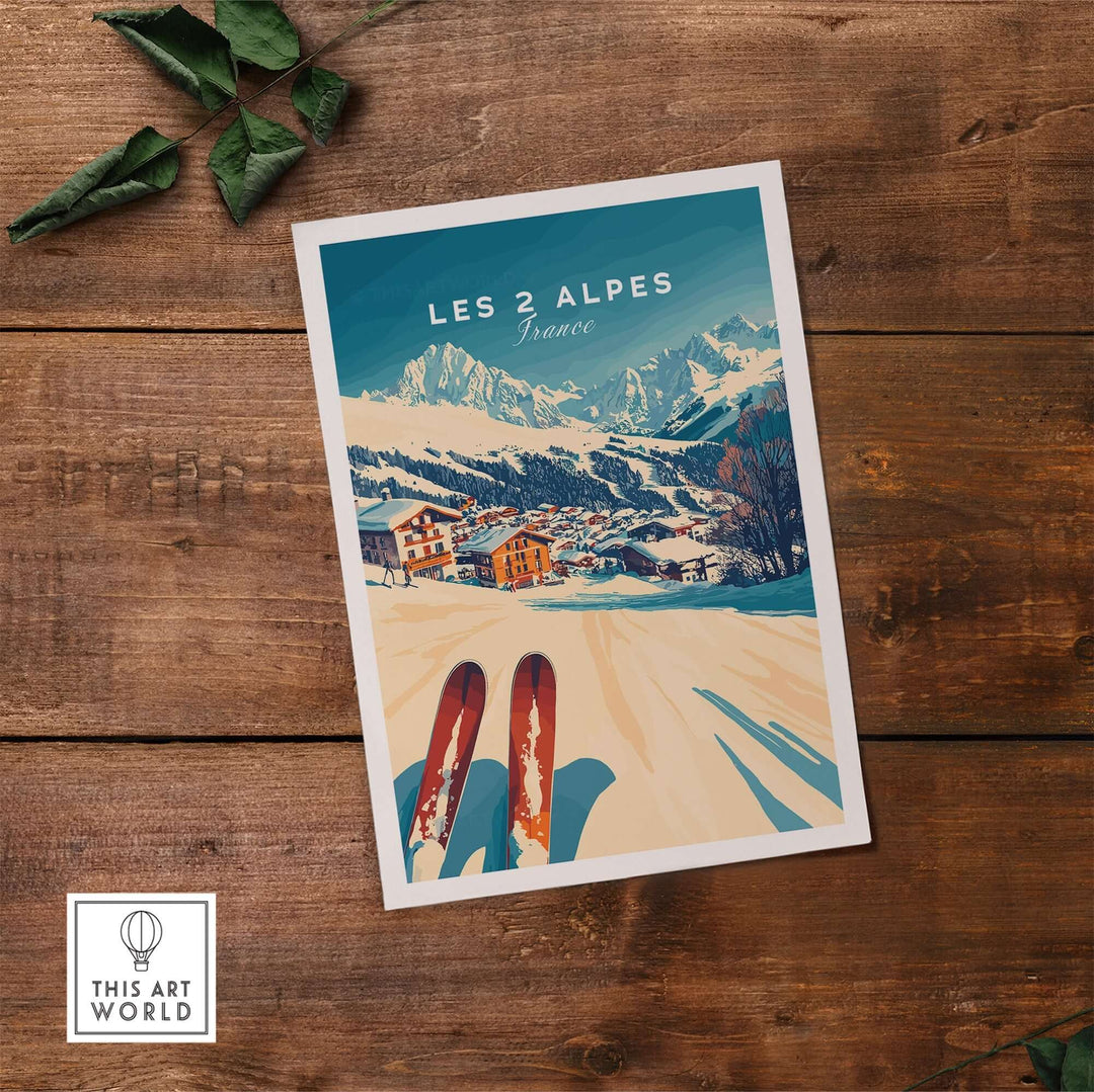 Les 2 Alpes Art Ski Print featuring vibrant ski scene and mountains, perfect for elevating ski decor.