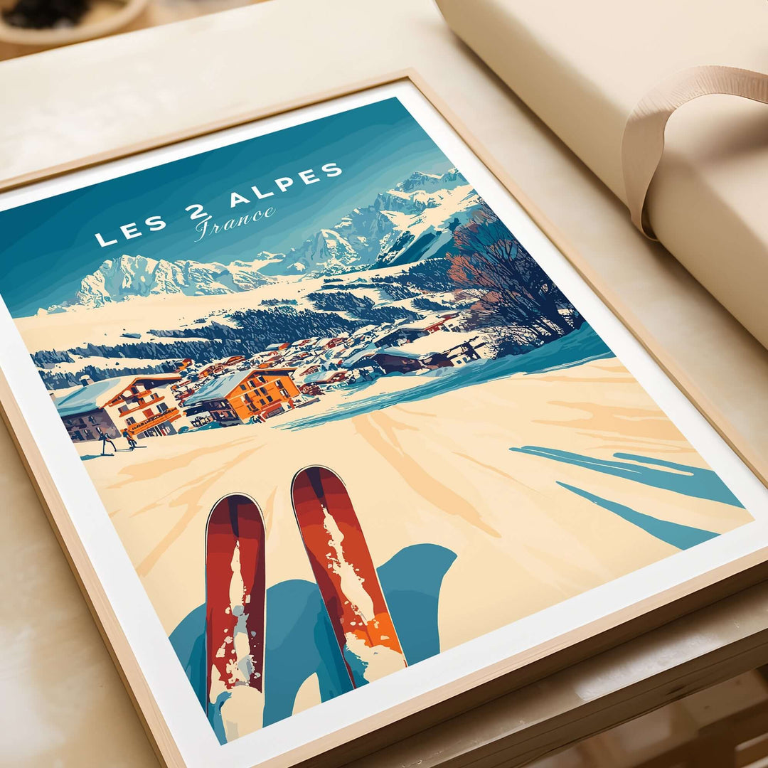 Les 2 Alpes Art Ski Print framed on a wooden table, showcasing vibrant ski-themed decor with a stunning mountain backdrop.
