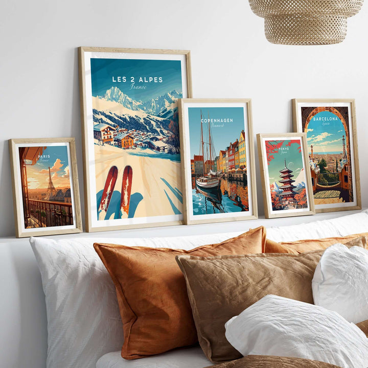 Colorful gallery wall featuring travel art prints, including Les 2 Alpes, capturing iconic locations and vibrant designs.