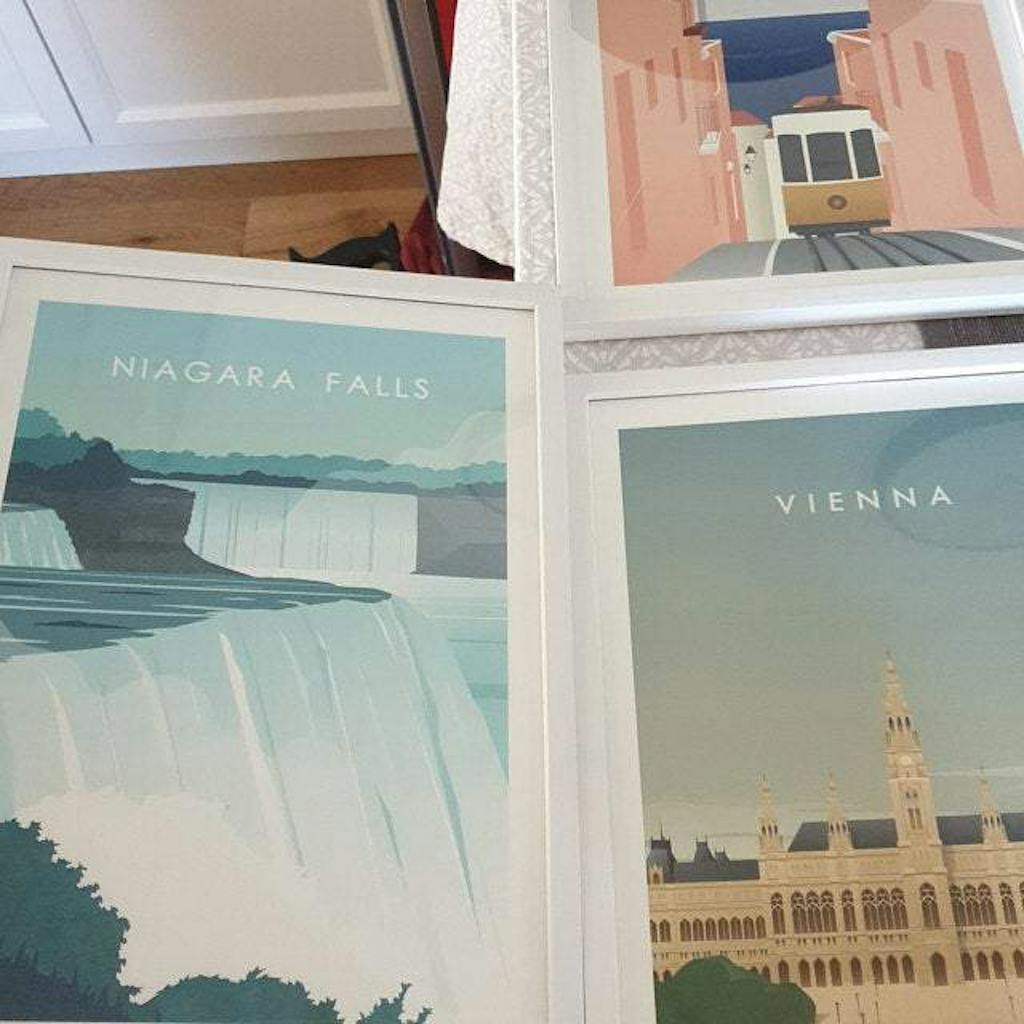 Gallery of travel-themed wall art posters featuring iconic cities and landscapes like Amsterdam, New York, Lisbon.