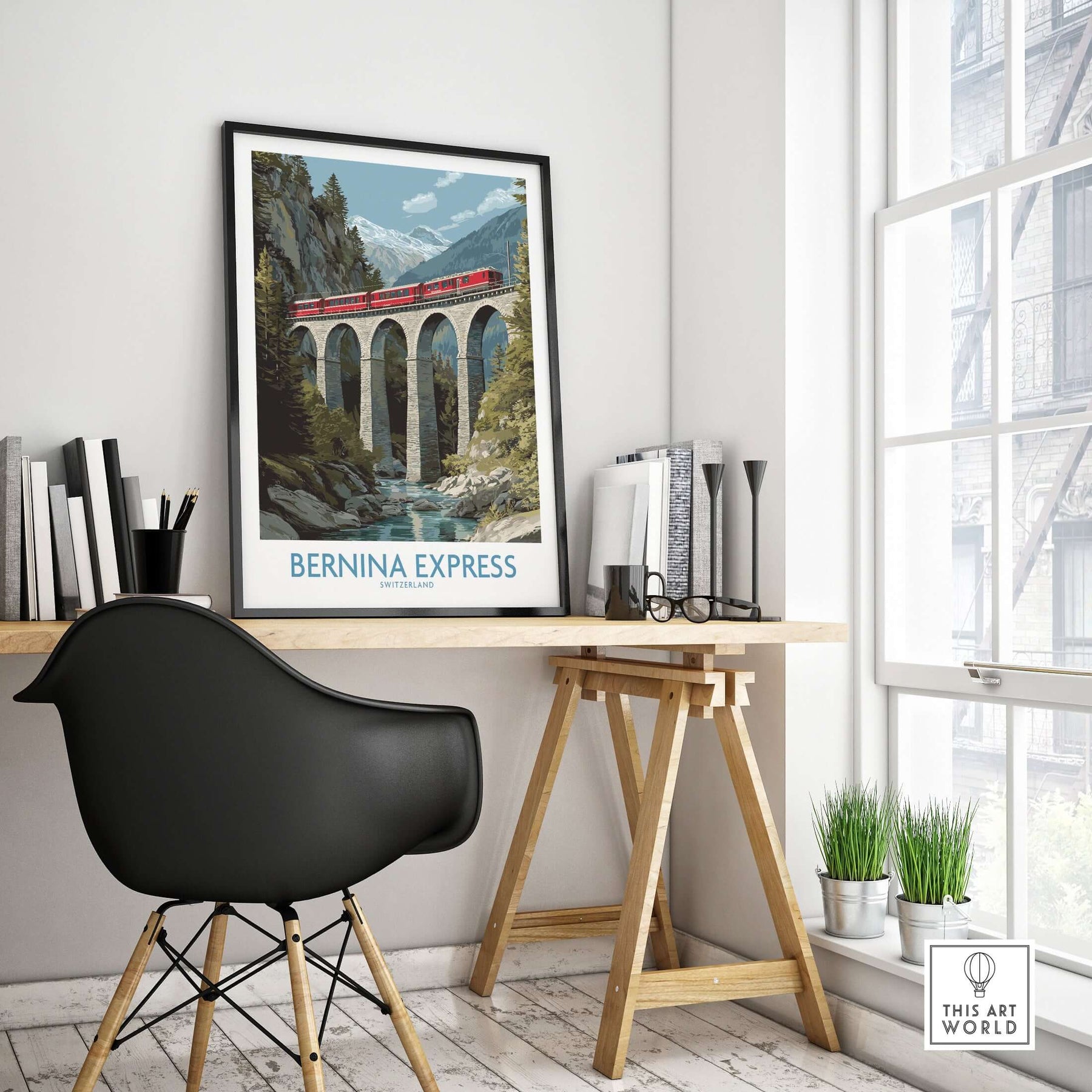 Bernina Express Switzerland Art Print | Landwasser Bridge Poster in a stylish office setting, showcasing Swiss nature and architecture.