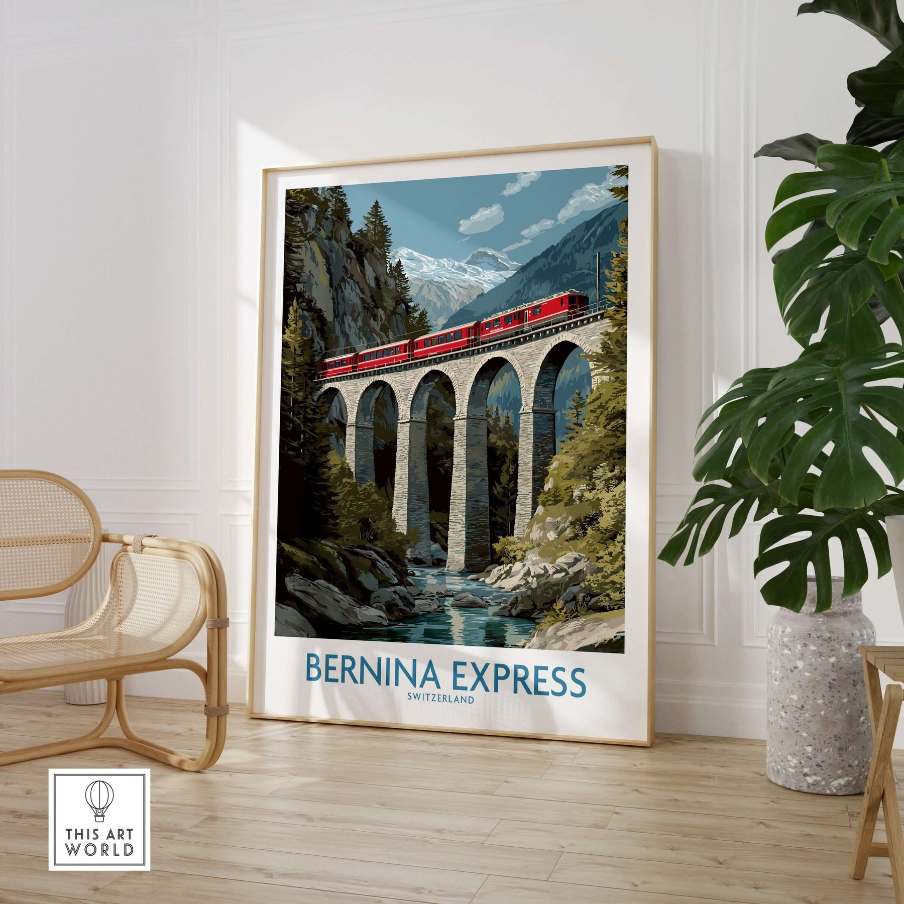 Bernina Express Switzerland Art Print | Landwasser Bridge Poster displayed in a cozy living room setting with natural decor.