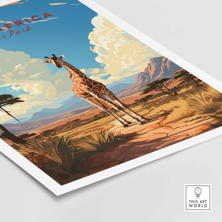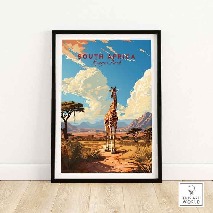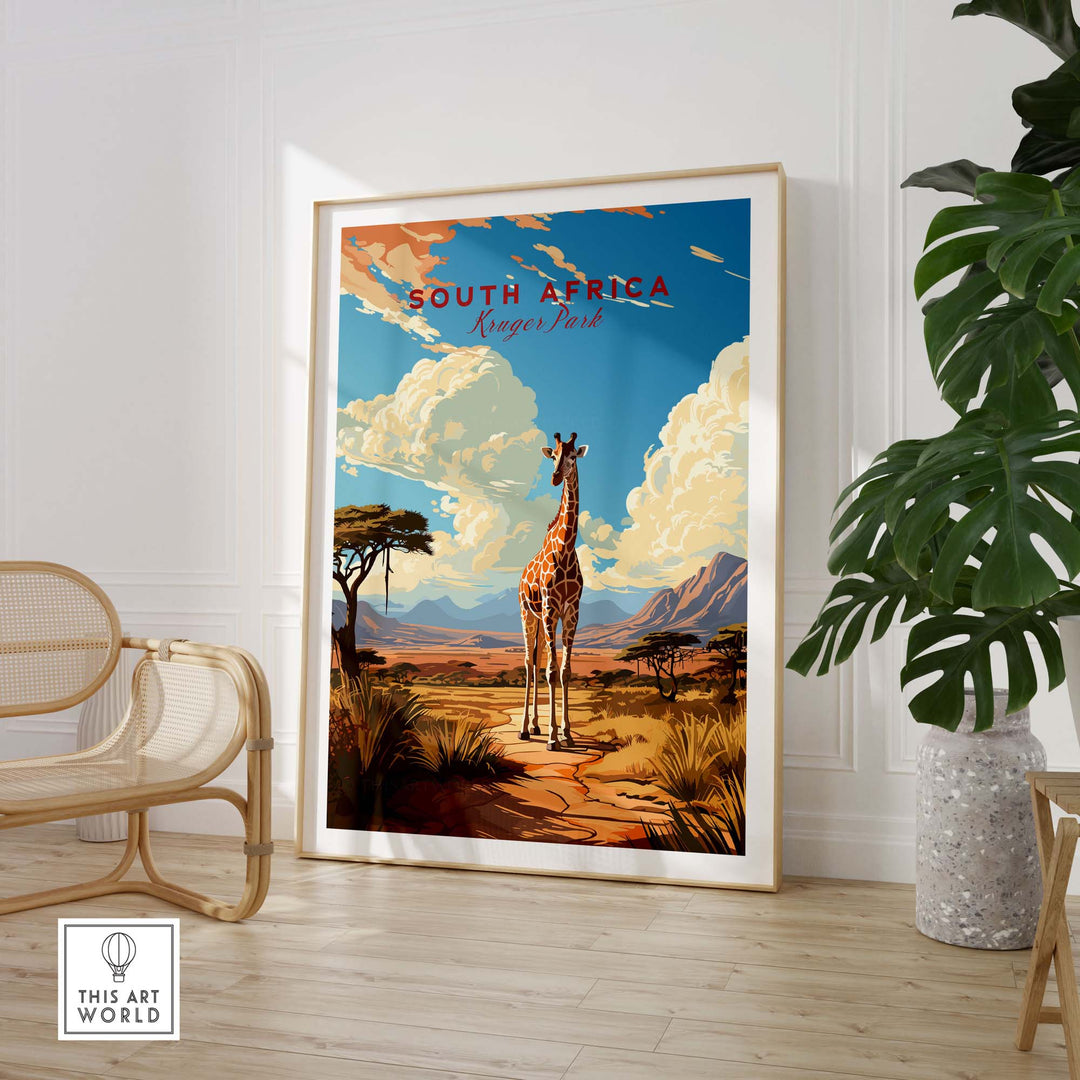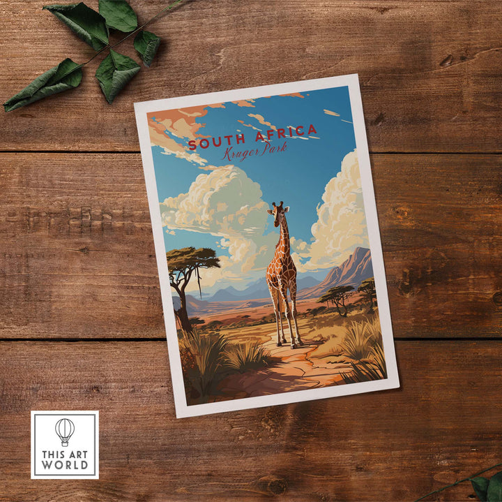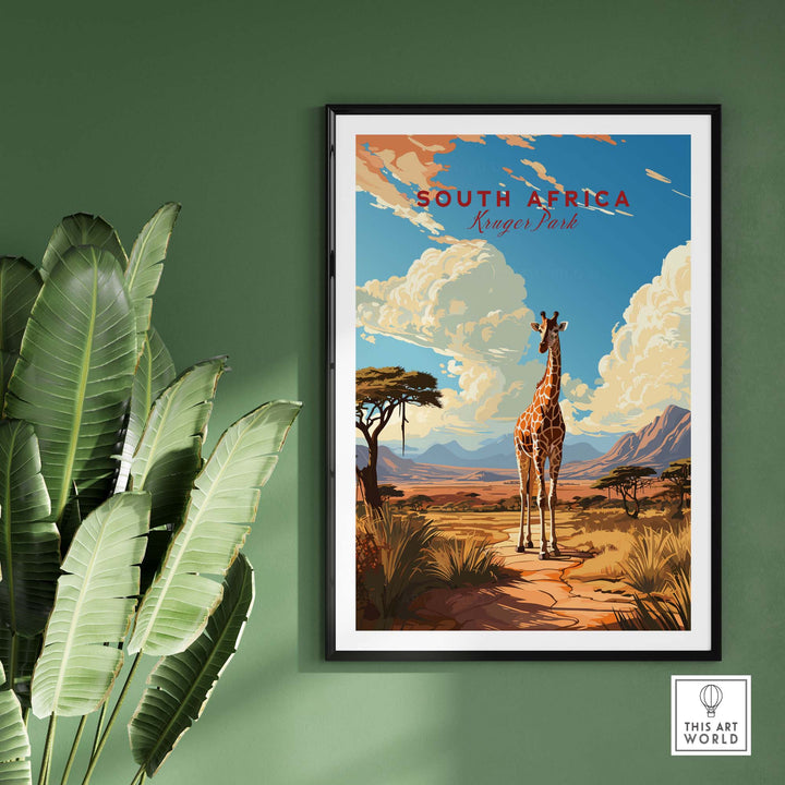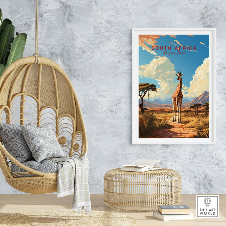 Bring the spirit of African safaris into your home with this stunning South Africa Art Print. Featuring Kruger Park, a giraffe, and a safari scene, this eye-catching poster is perfect for adding a touch of Art Deco to your gallery wall and taking you on a journey of exploration and discovery.