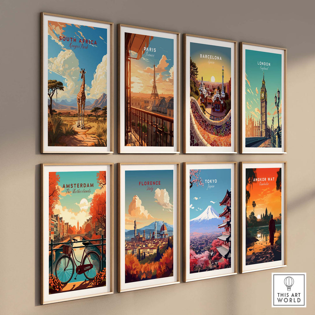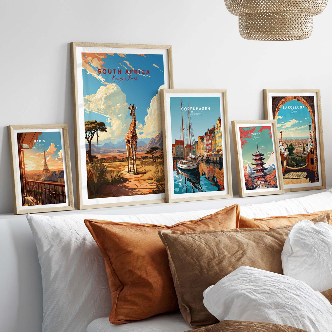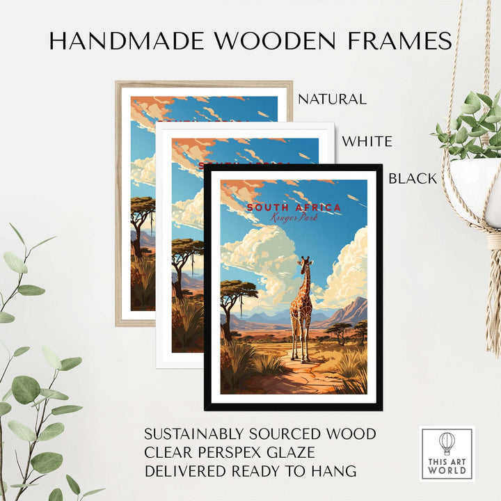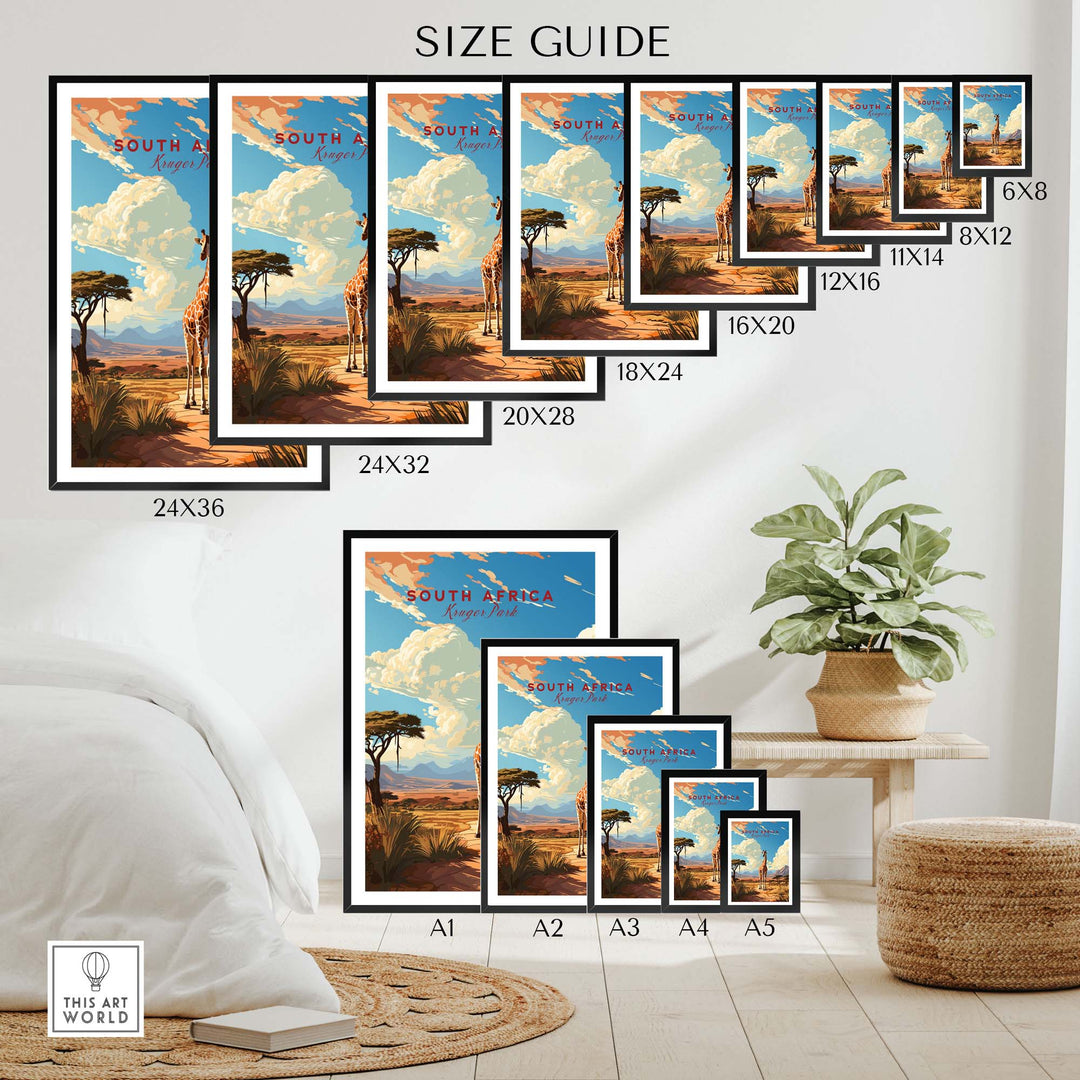 Bring the spirit of African safaris into your home with this stunning South Africa Art Print. Featuring Kruger Park, a giraffe, and a safari scene, this eye-catching poster is perfect for adding a touch of Art Deco to your gallery wall and taking you on a journey of exploration and discovery.