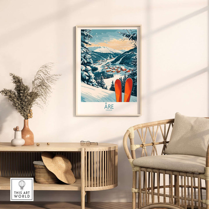 Åre Sweden ski poster displayed in a cozy living room, showcasing a winter landscape and vibrant ski graphics.