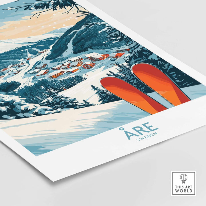 Åre Sweden ski poster featuring vibrant orange skis overlooking snowy slopes and charming village nestled in the mountains.