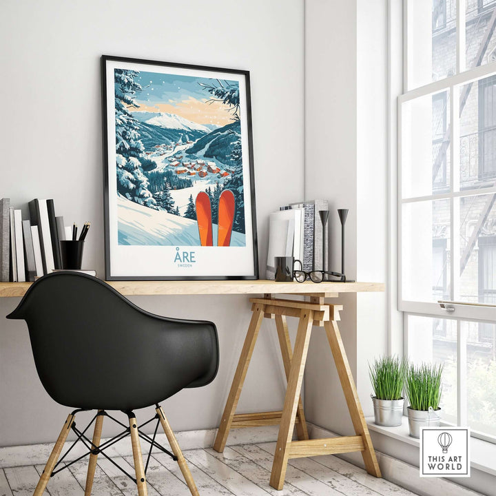 Åre Sweden Ski Poster displayed in a modern home office, showcasing stunning mountain views and ski elements.