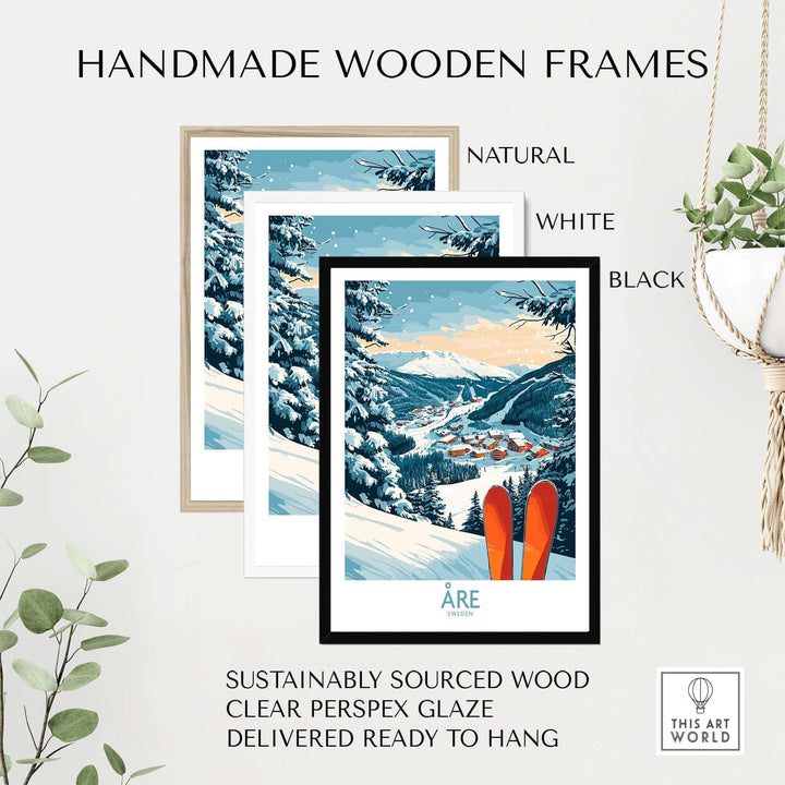 Handmade wooden frames in natural, white, and black for Åre Sweden Ski Poster, featuring sustainably sourced wood.