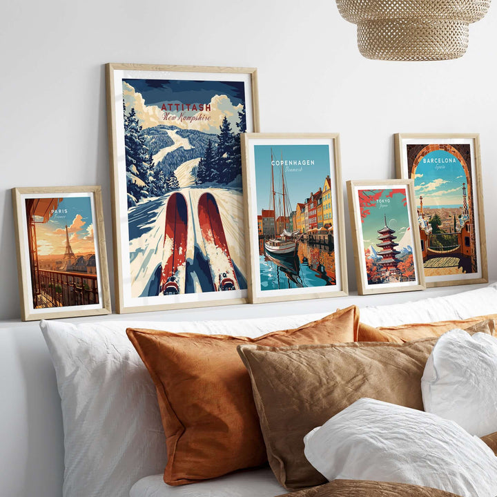 Stylish display of travel-themed prints including Attitash Ski Print on a cozy bed with decorative pillows.