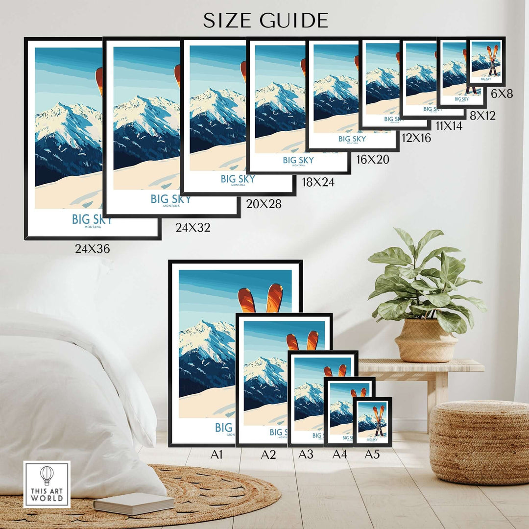 Size guide for Big Sky Montana poster showcasing various frame sizes in a cozy room setting.