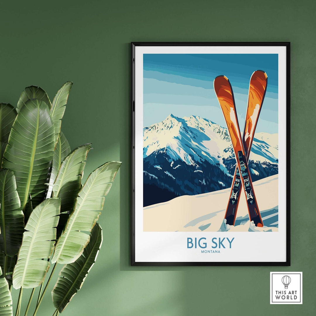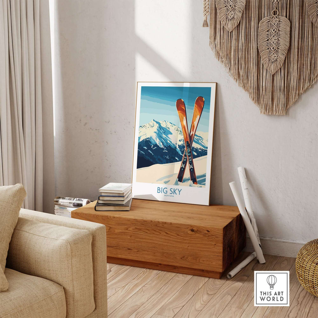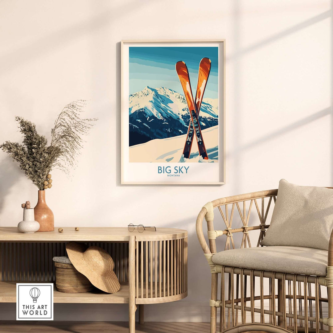 Big Sky poster featuring skiing in Montana, beautifully displayed in a modern living room setting.