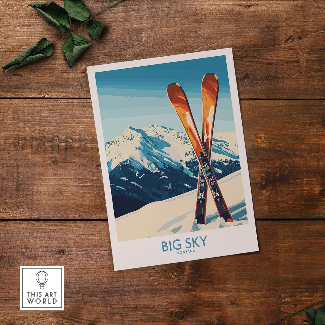 Big Sky poster featuring vintage skis against a stunning Montana landscape, perfect for ski enthusiasts and adventure lovers.