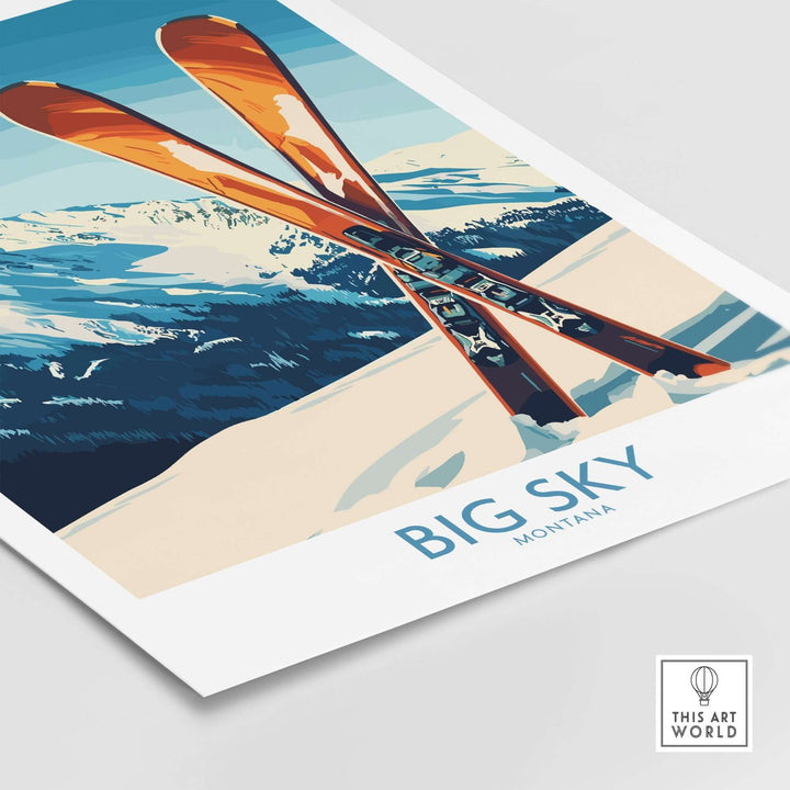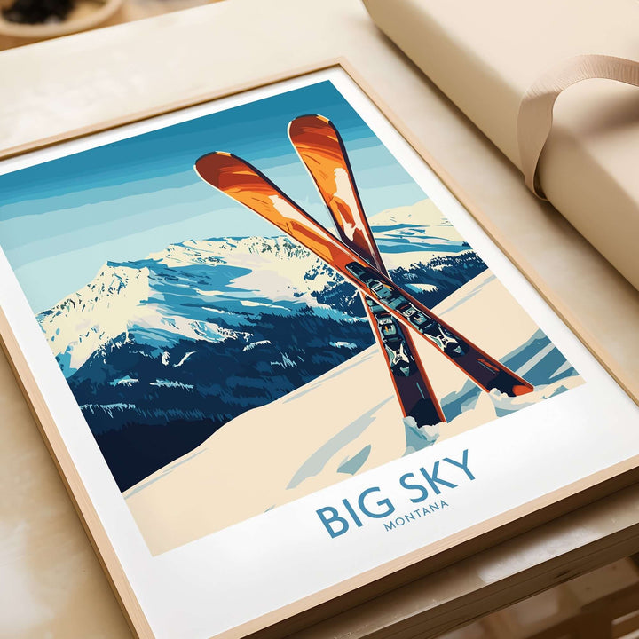 Big Sky Montana poster featuring skis and snowy mountains, perfect for ski enthusiasts and adventure lovers.