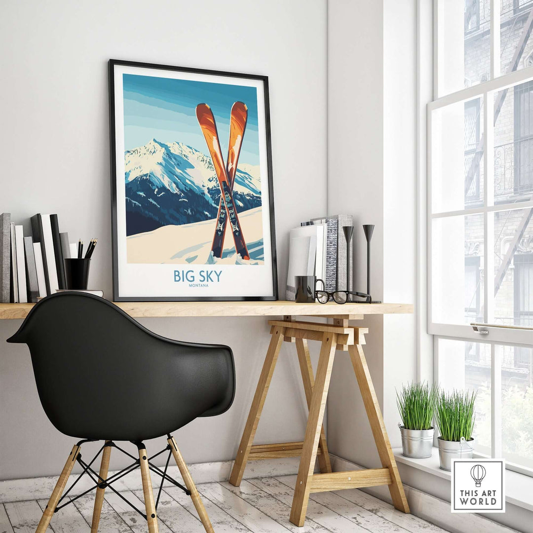 Big Sky poster featuring ski equipment, displayed in a stylish home office setting with a modern chair and natural light.