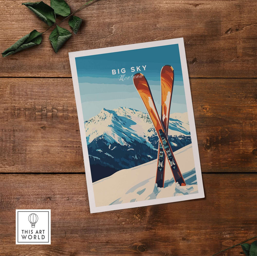 Big Sky Print Montana ski poster featuring classic skis against a stunning mountain landscape. Perfect for home decor.