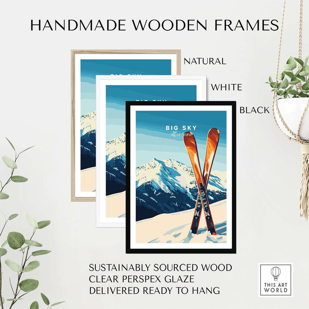 Handmade wooden frames in natural, white, and black for Big Sky Print Montana ski poster, made from sustainably sourced wood.