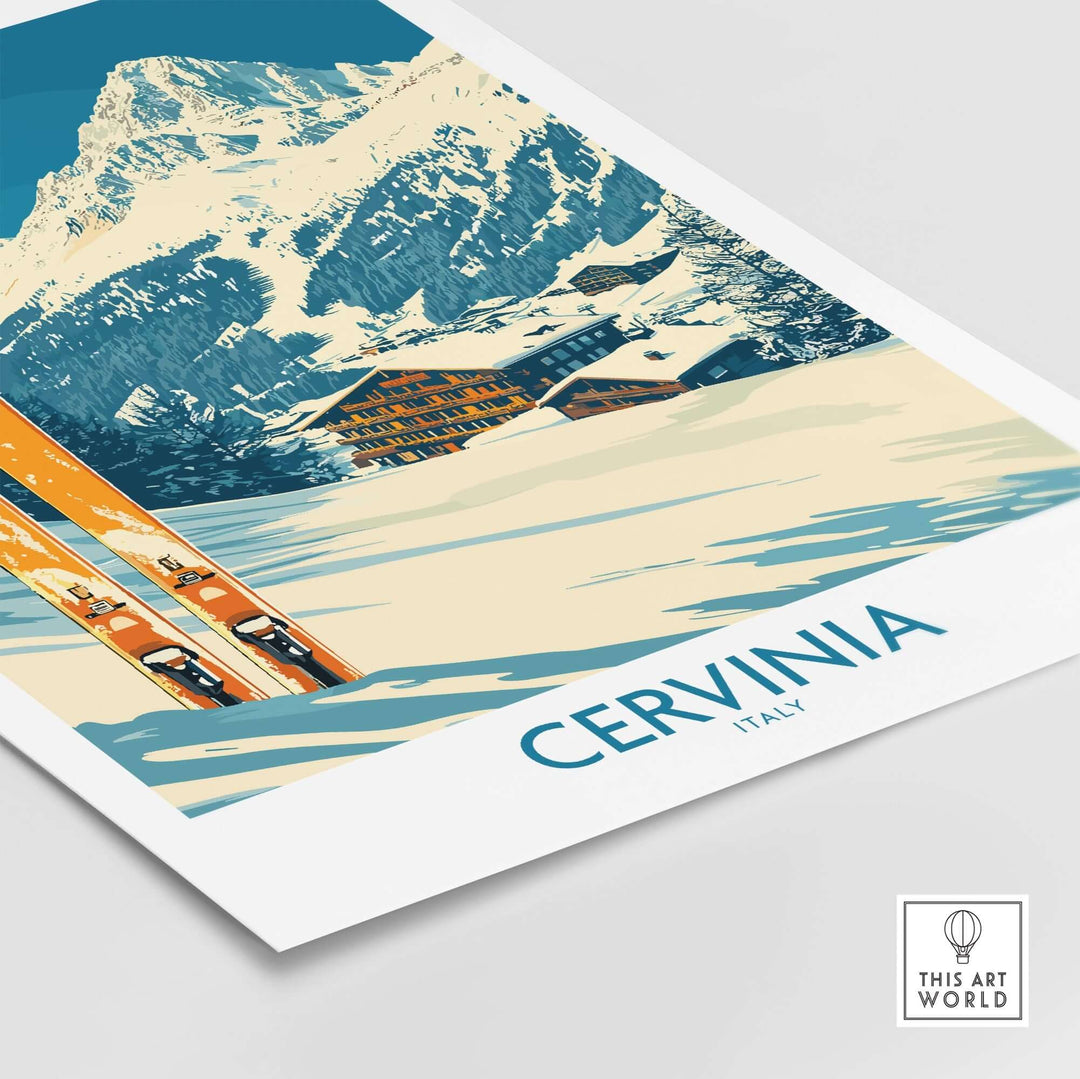 Cervinia ski wall art poster featuring vibrant skis and a picturesque snowy landscape, perfect for ski lovers' decor.